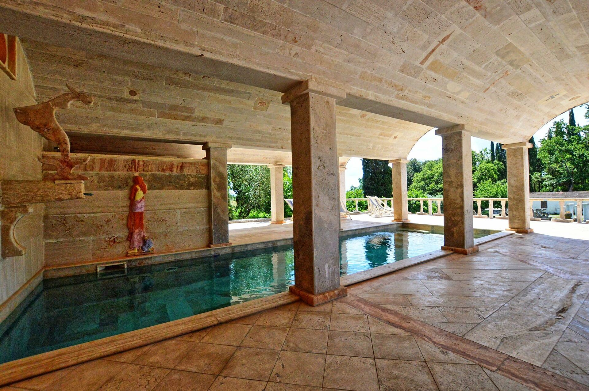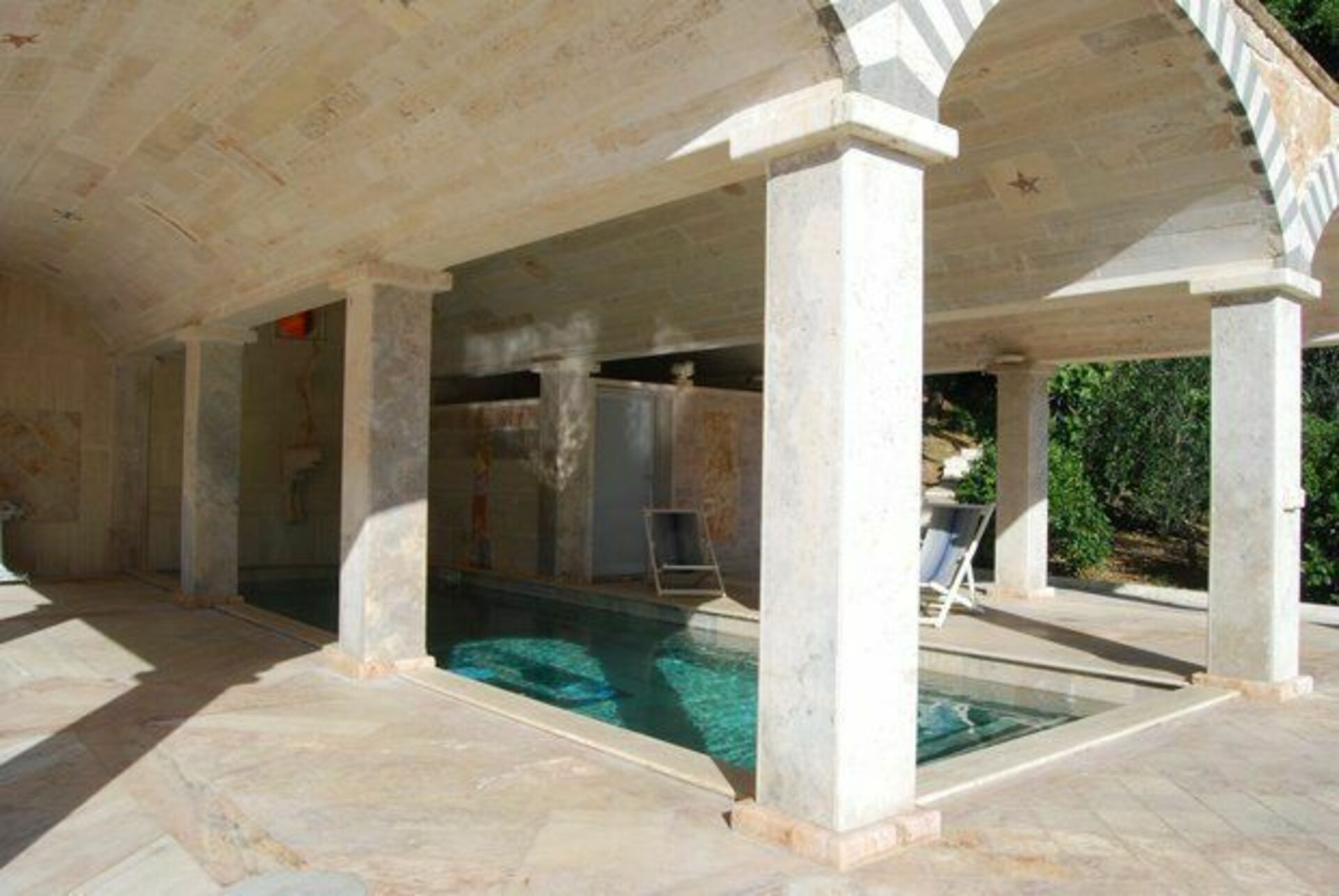 - piscine d’eau chaude (température de l’eau: 36° à l’arrivée dans le bassin) couverte par une voûte en travertin (9 x 3 mètres; profondeur: 1,40 mètre; ouverte et disponible toute l’année)