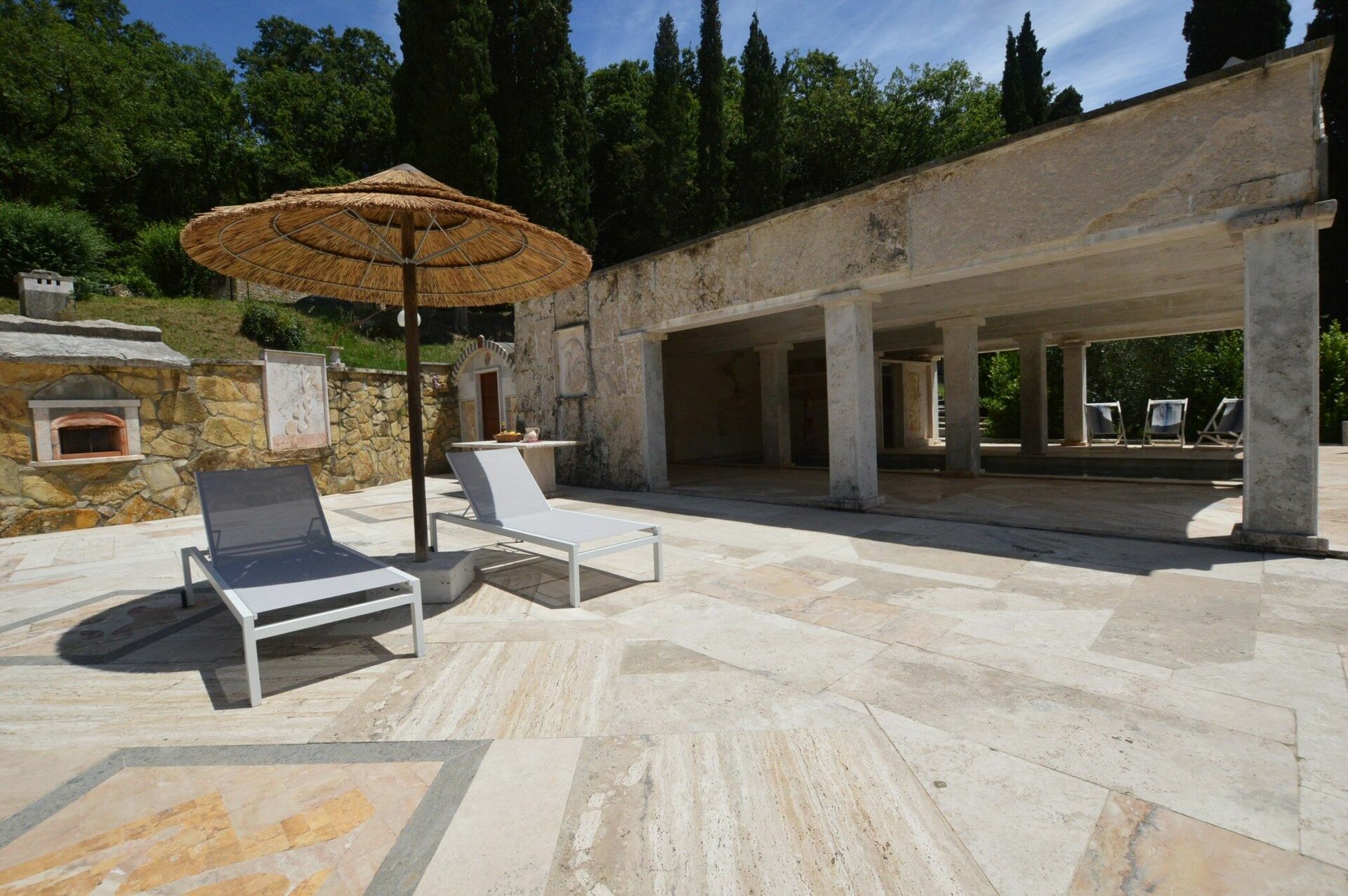 - grand solarium en travertin avec chaises longues, parasols et douche (eau chaude)