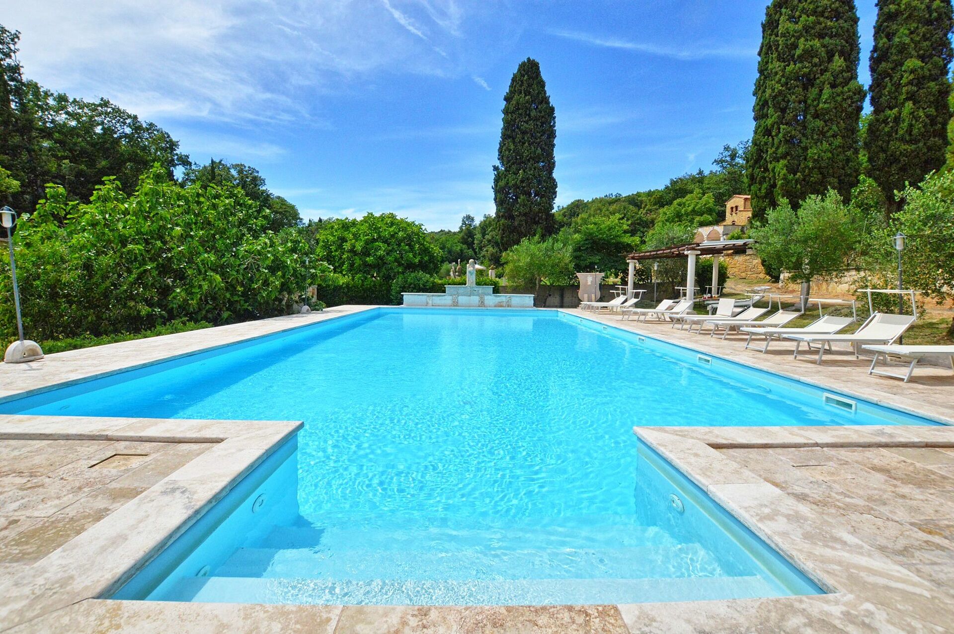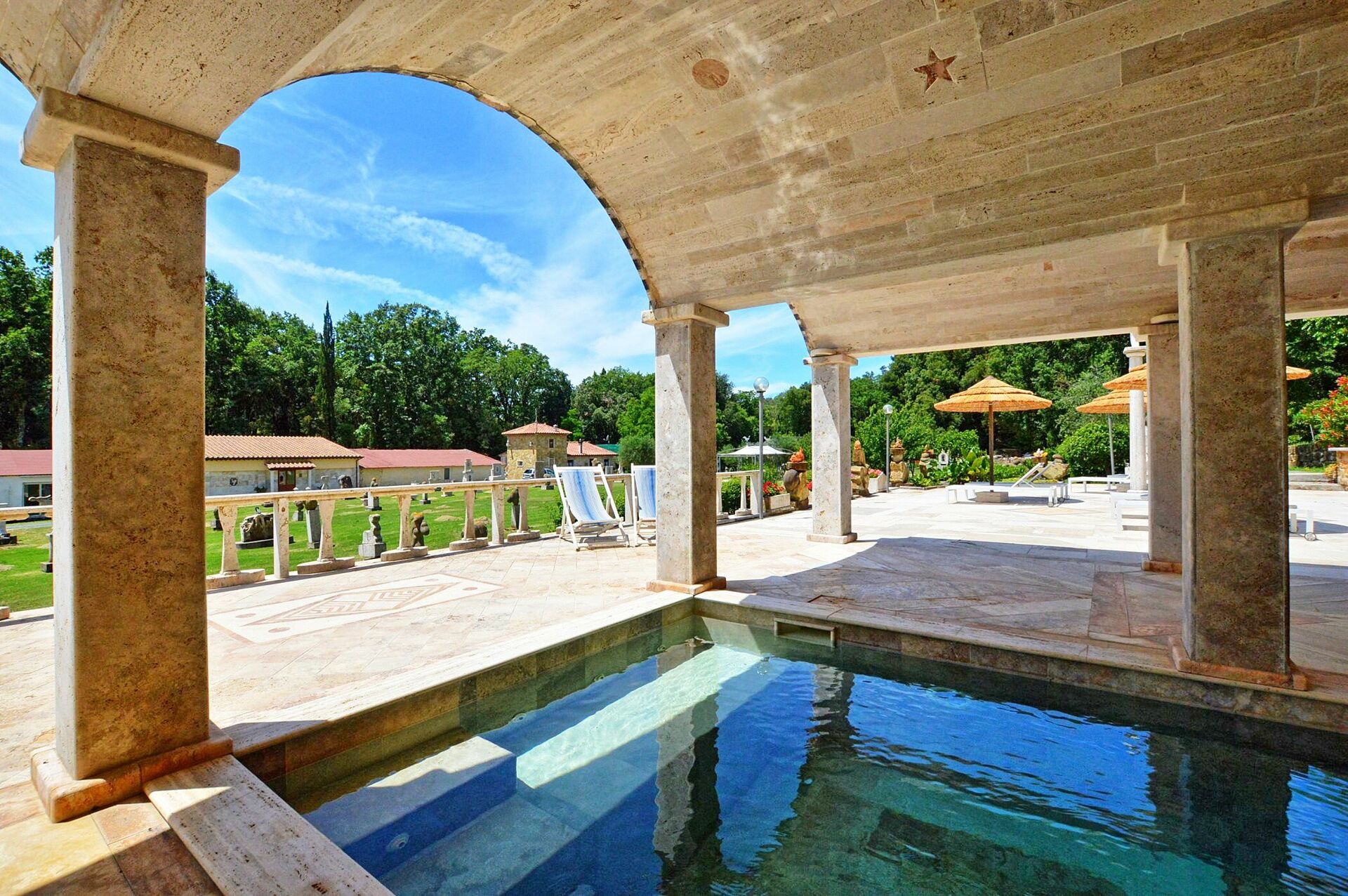 Les hôtes pourront profiter de vastes espaces extérieurs communs avec 2 piscines à leur disposition: une piscine en plein air et une seconde couverte par une magnifique voûte en travertin (toujours à l’extérieur) naturellement chauffée à 36° grâce à la chaleur géothermique. Cette piscine chauffée permettra de se baigner même durant les saisons les plus fraîches!