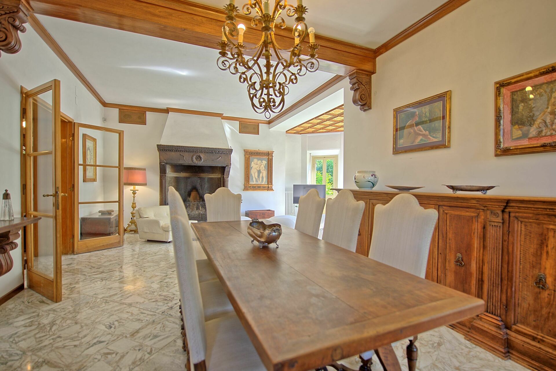 Rez-de-chaussée: entrée, grand séjour (TV-sat, Sky, Astra) avec cheminée et zone repas, cuisine (frigo, micro-ondes, grille-pain, cafetière avec filtre, machine à café espresso, bouilloire, four, coupe-jambon, lave-vaisselle, freezer), deuxième salle à manger avec cheminée, salle de bains avec douche.