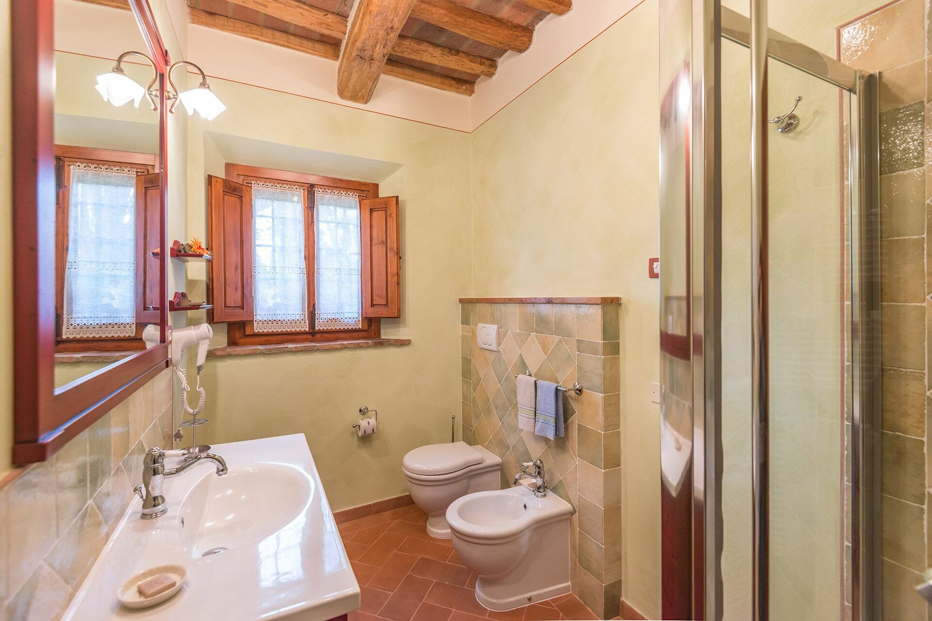 Rez-de-chaussée : salon avec canapé-lit double (avec supplément), salle à manger avec cuisine et cheminée, deux chambres doubles, deux salles de bains avec douche.