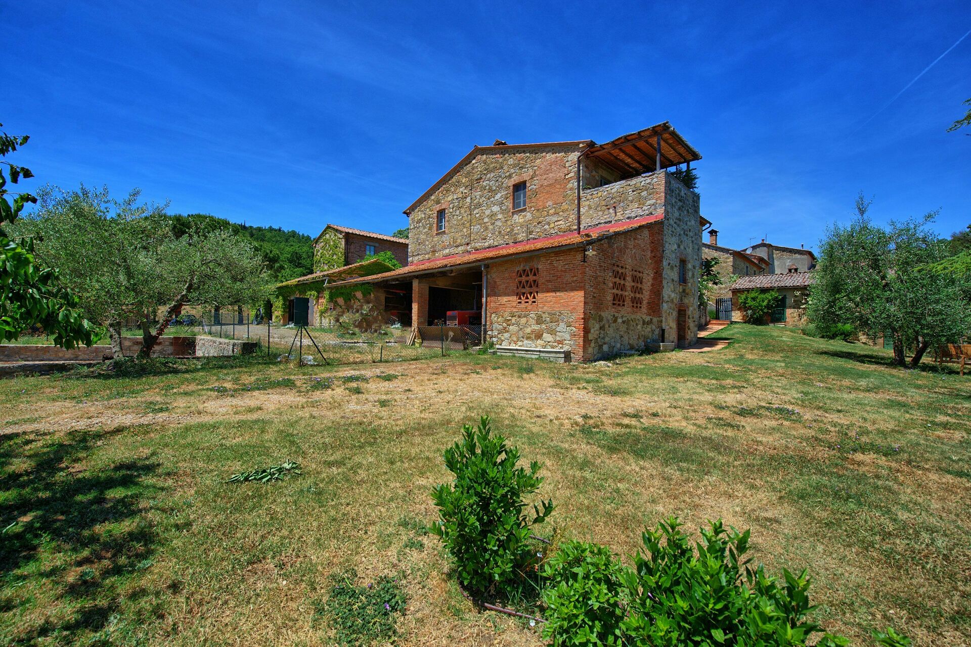 La maison est née de la restructuration d’une partie de ferme (l’autre partie fait office de dépôt agricole). Grand jardin avec piscine en position panoramique.