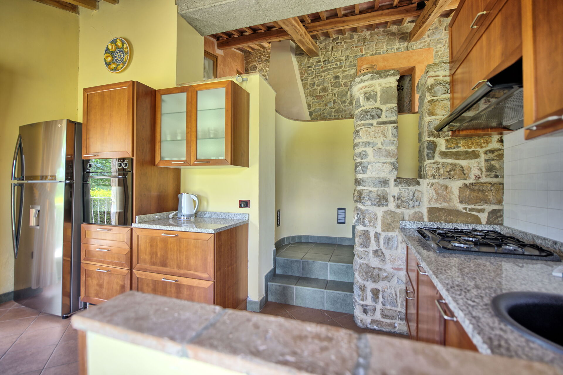 Rez-de-chaussée inférieur (7 marches en dessous) (accessible également par une entrée indépendante): cuisine (lave-vaisselle, cafetière moka, bouilloire, réfrigérateur, congélateur, four, plaque de cuisson, grille-pain), salle de bain avec baignoire.