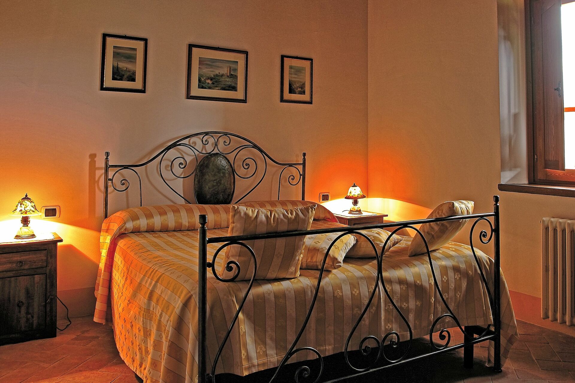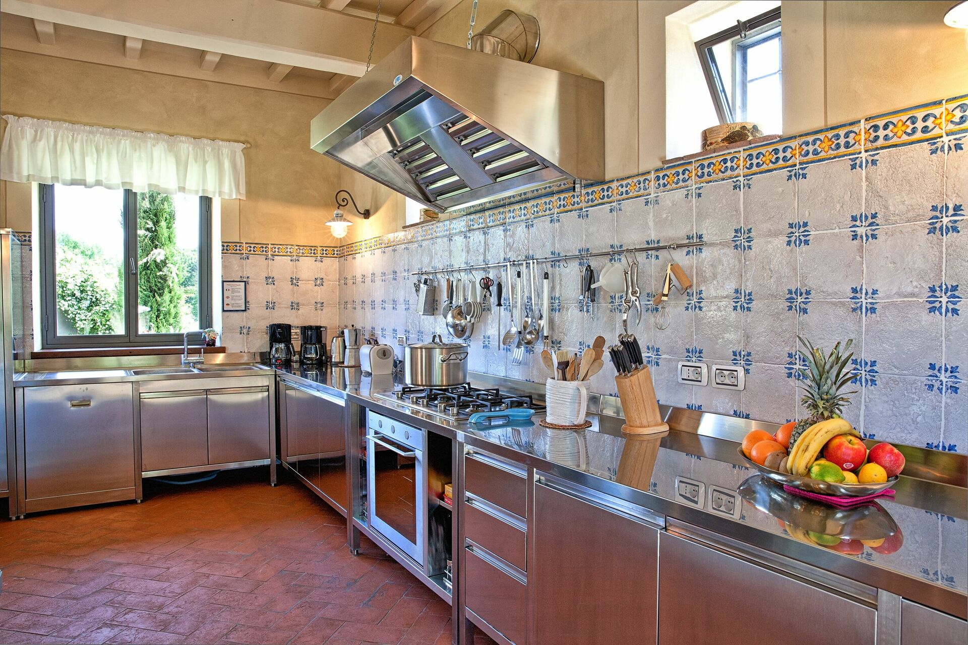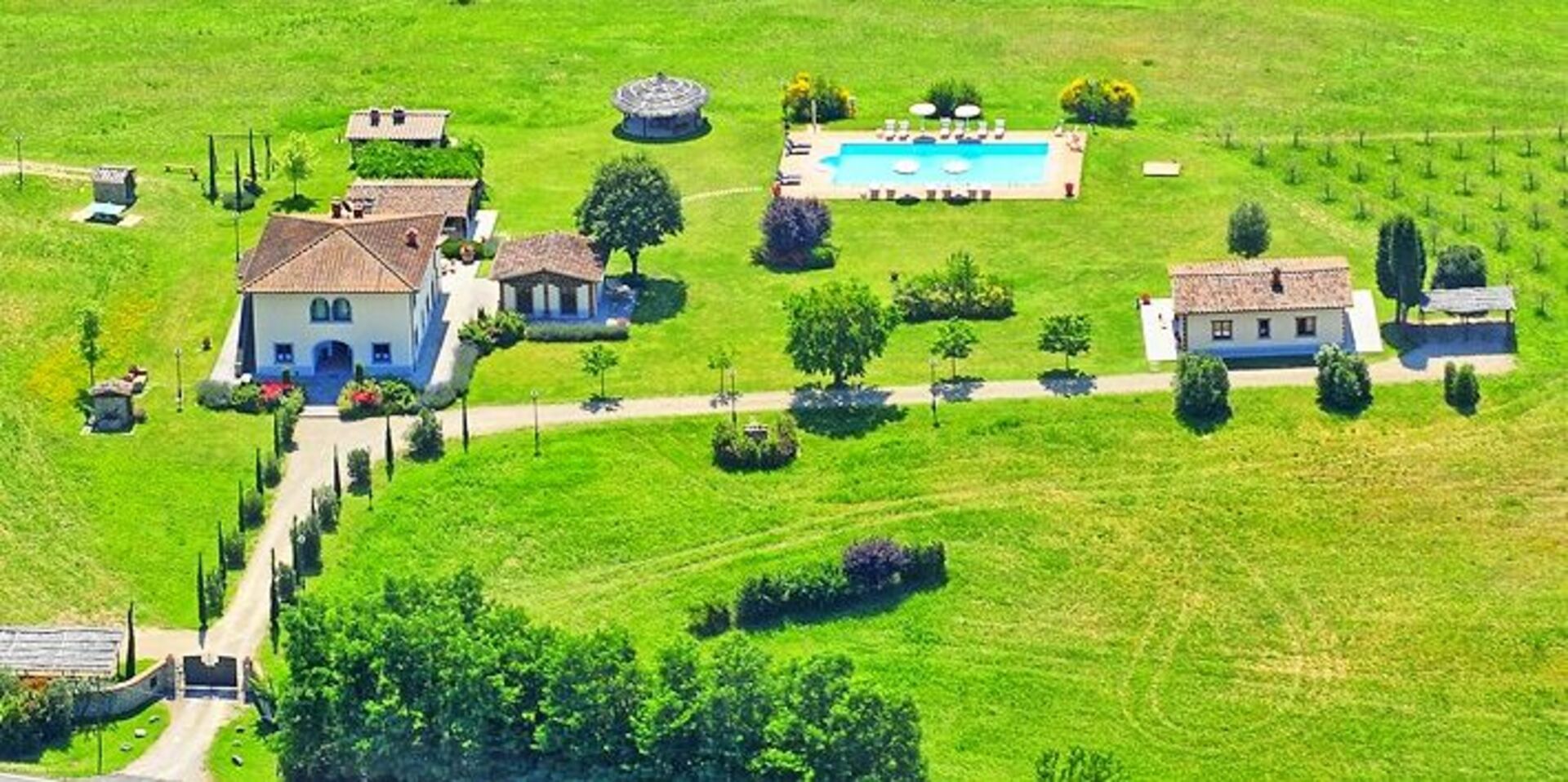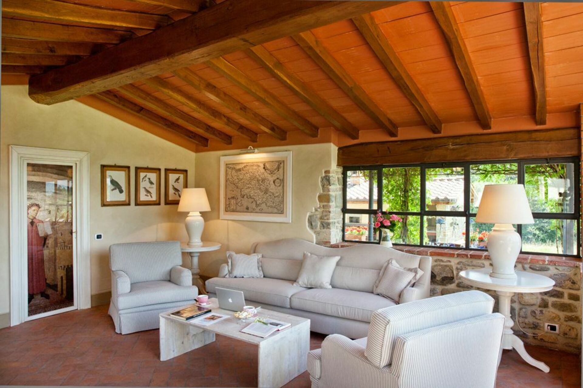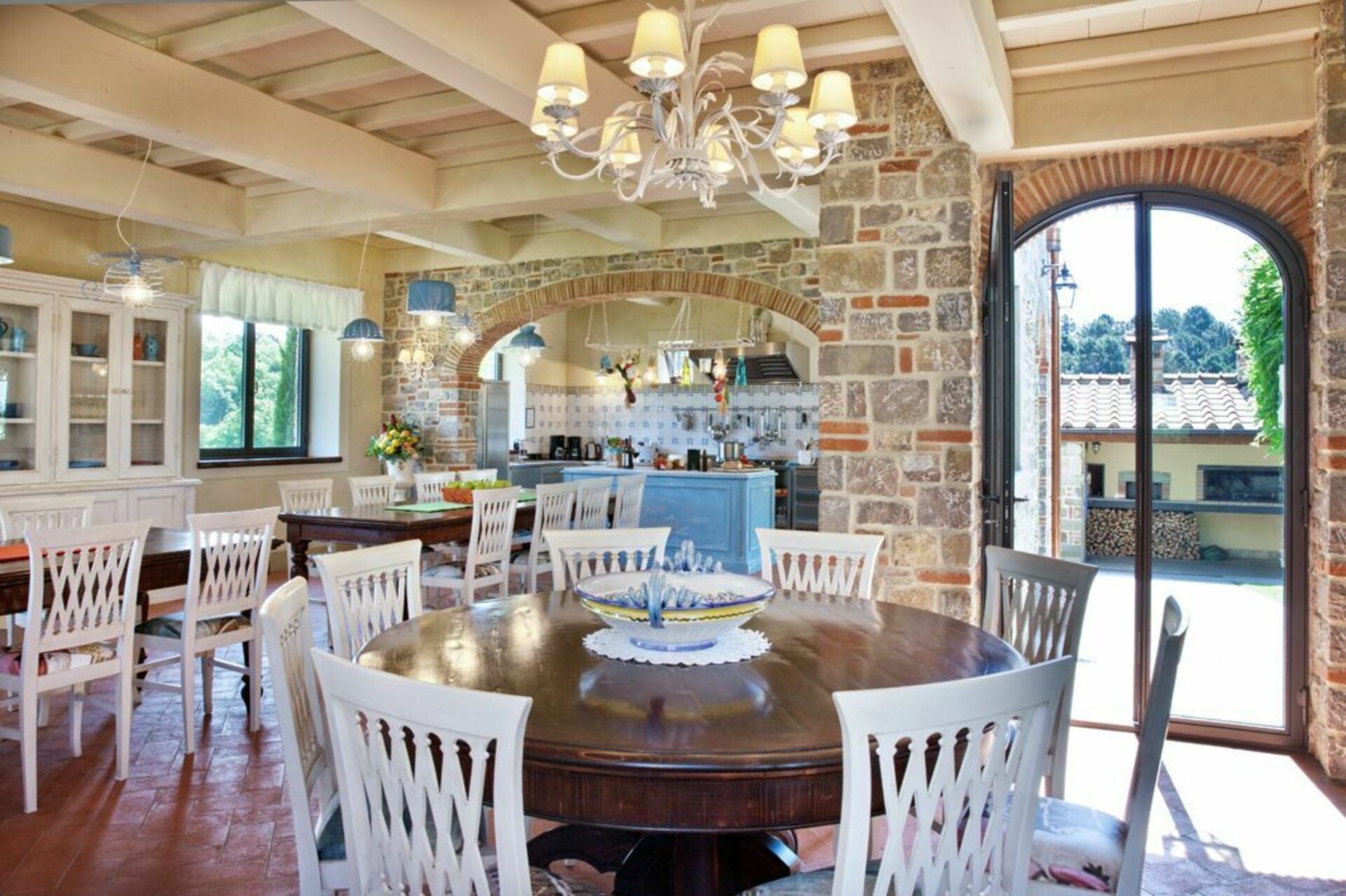 Récemment rénovée, elle a conservé son charme d'origine grâce à ses finitions soignées, comme les anciennes poutres en bois, les sols en terre cuite et les cheminées en pierre dans les salons, le choix des couleurs et les pièces vastes et lumineuses. Le mobilier, choisi avec soin, est tout à fait fonctionnel et confortable, mais il se distingue par le raffinement des compléments et la chaleur apportée par les meubles typiquement toscans, comme il convient à toute maison toscane classique.