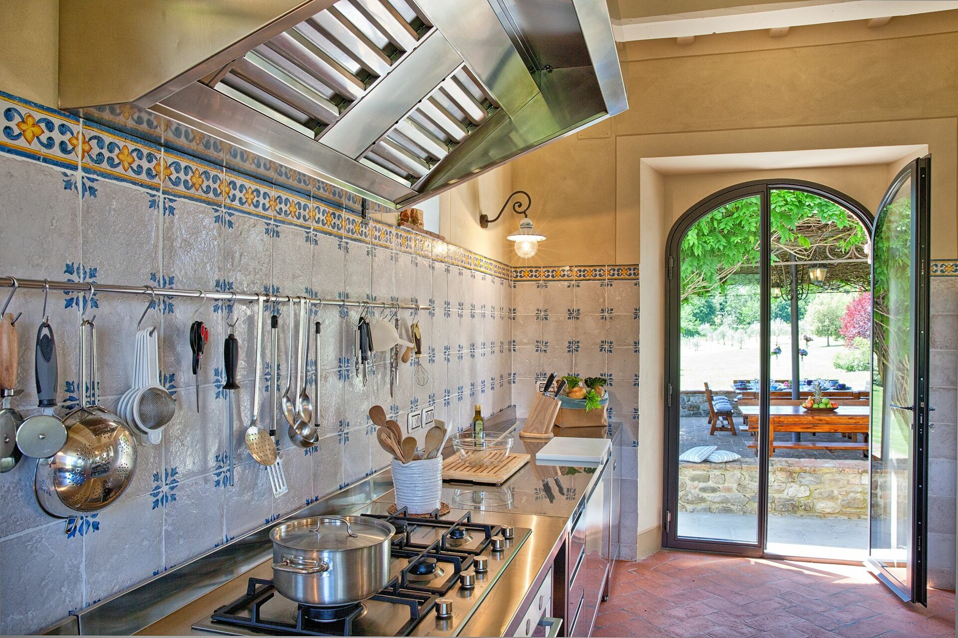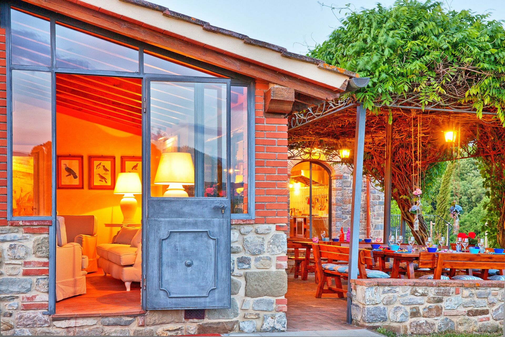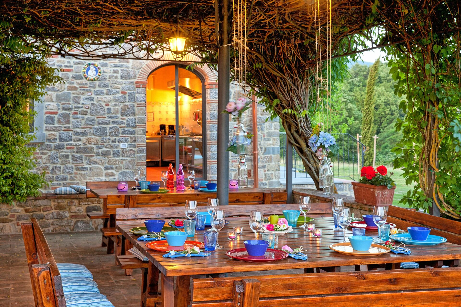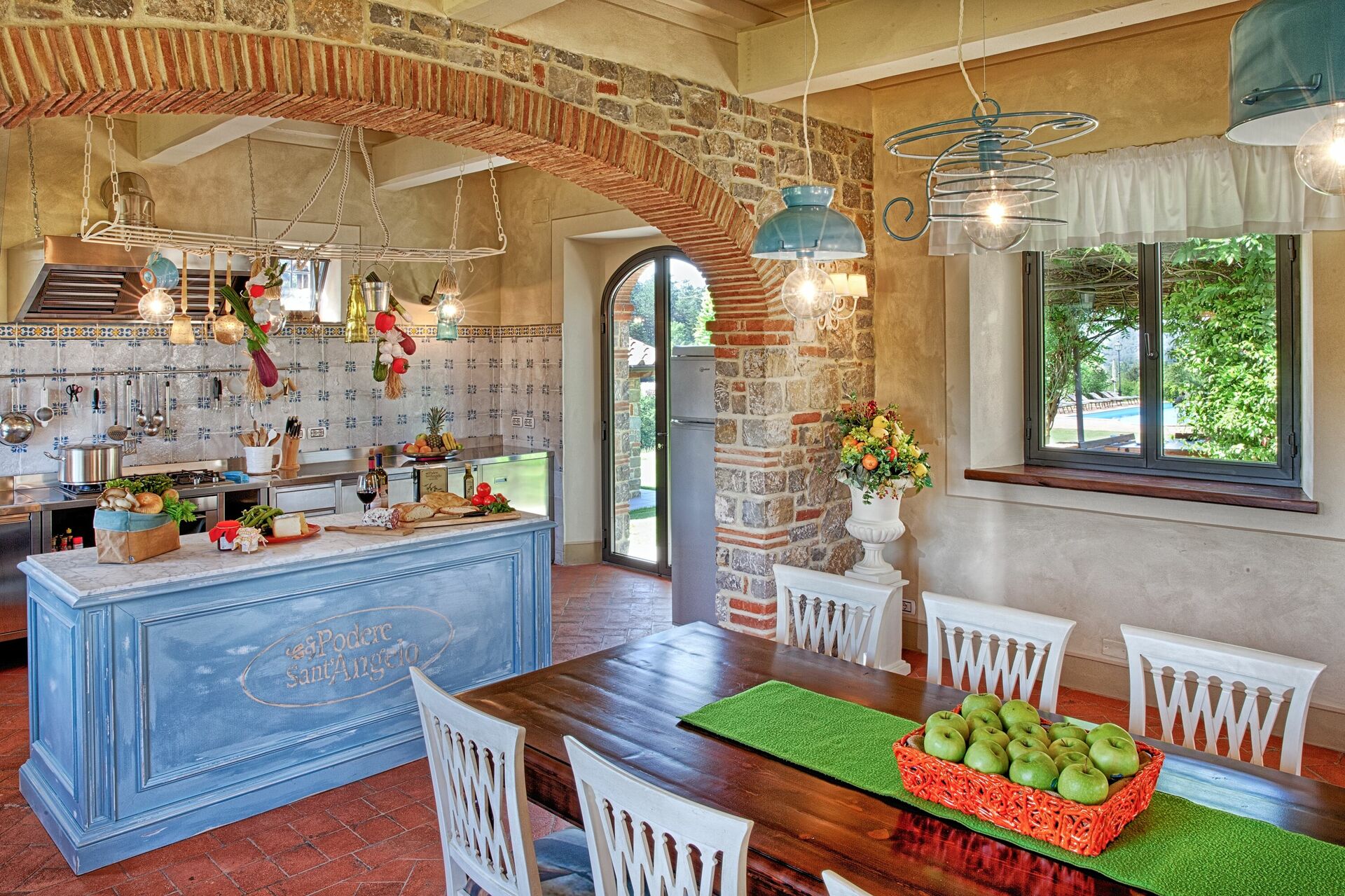 L'endroit idéal pour préparer les repas et manger ensemble: elle est située au centre du jardin et se compose d'une grande salle à manger avec une cuisine entièrement équipée, une terrasse avec une pergola meublée avec des tables et des chaises d’où on accède au four à bois et au barbecue.