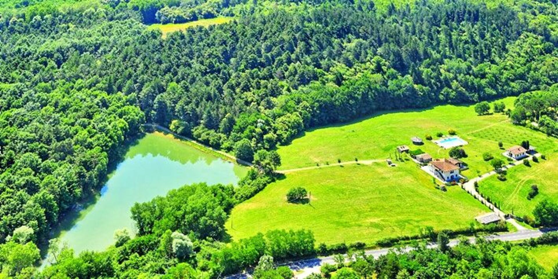 Elle est entourée d'un grand jardin où se trouve la piscine (16 x 8 mètres) d'où l'on peut accéder au lac par un chemin interne de la propriété, un court de tennis et un sentier de randonnée à travers la forêt avec ses grands arbres.