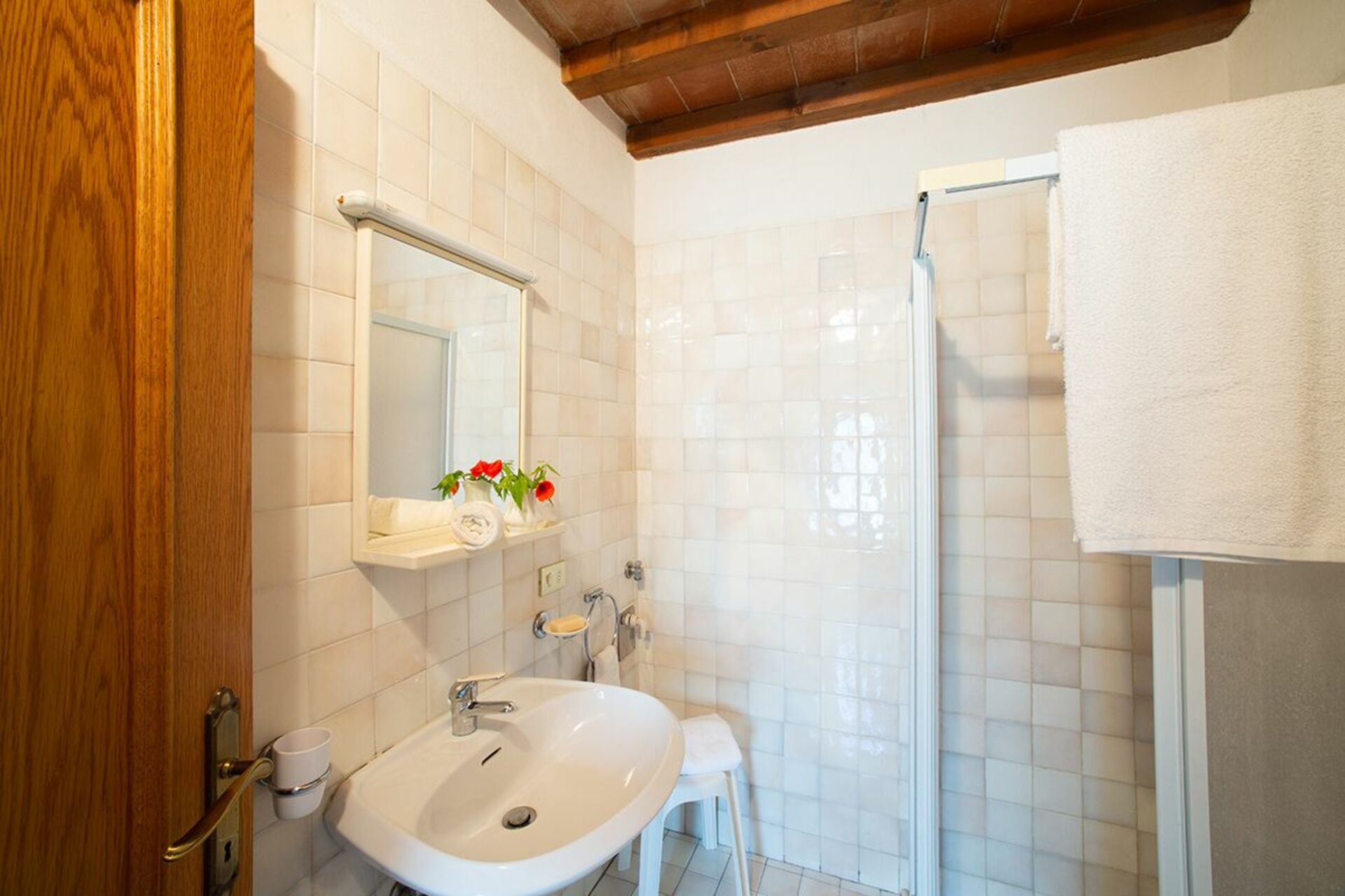 Premier étage: chambre double, chambre avec deux lits simples (joignable sur demande), chambre avec lit simple, salle de bain avec douche.