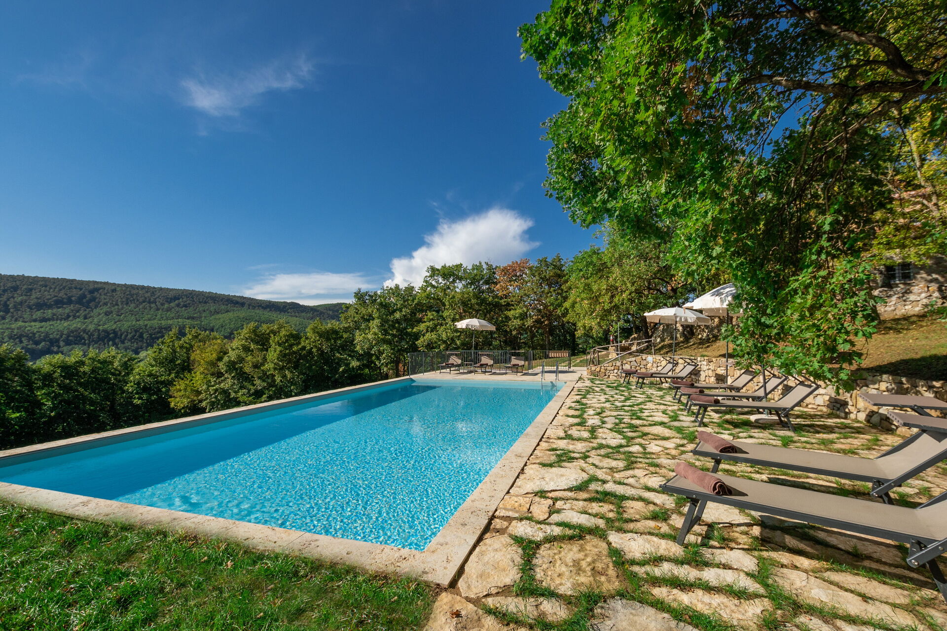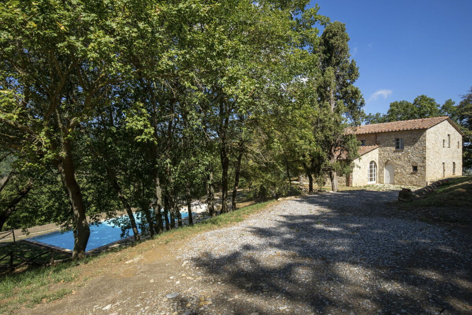 Ancienne villa en pierre entièrement restructurée et transformée en une belle demeure avec piscine privée en location en Toscane sur les collines de San Casciano dei Bagni.
