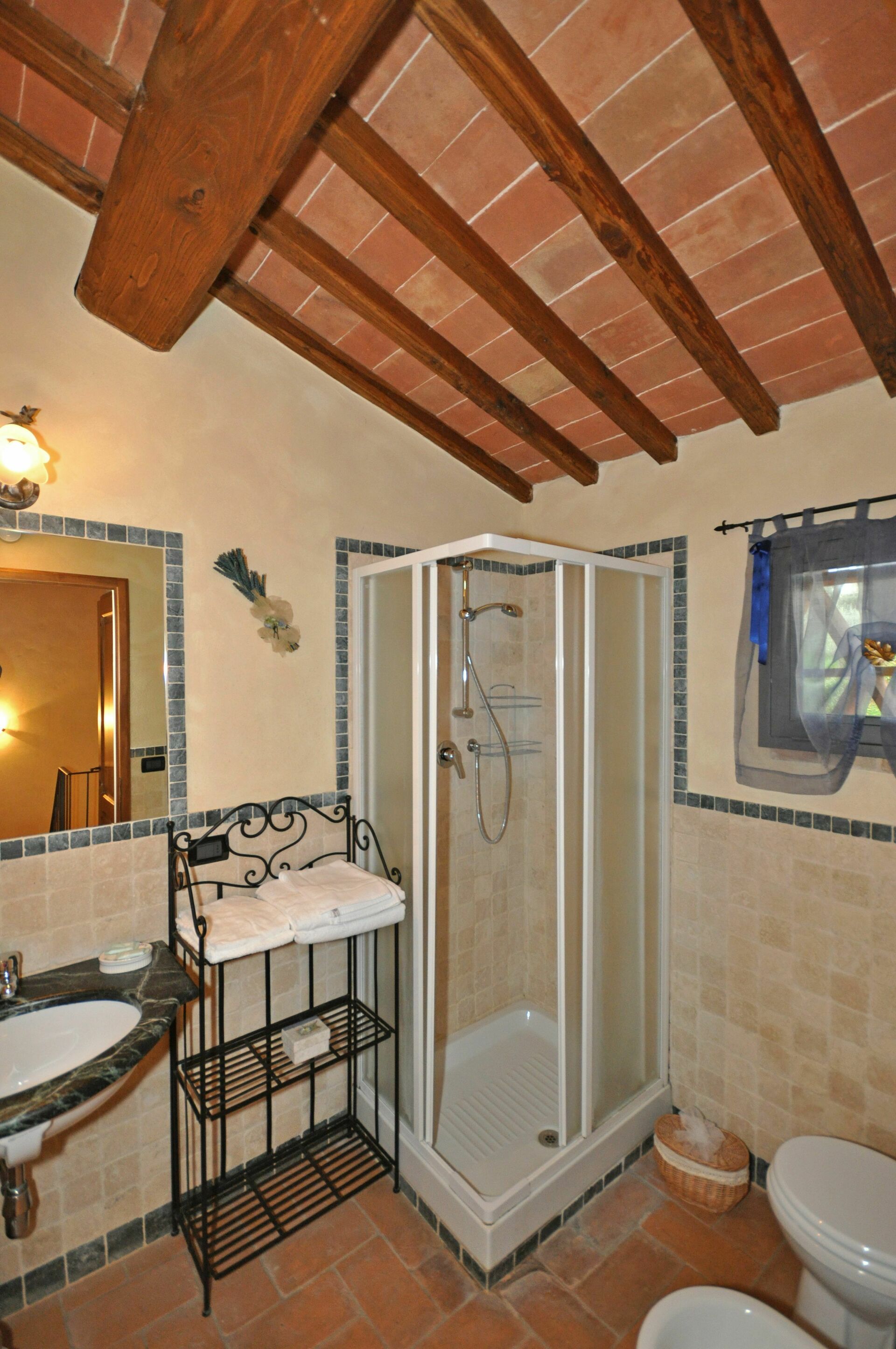 Premier étage : une grande chambre double avec lit supplémentaire à une place sur demande (30 € par personne par jour), salle de bains avec douche.