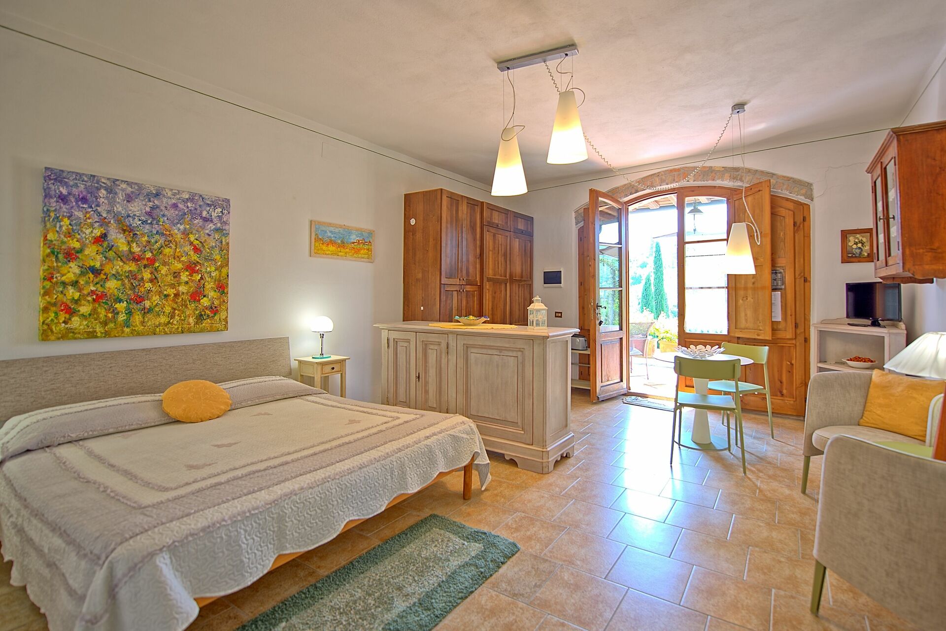 The first thing that hits you on arrival is the view, it is everything we expected from our Tuscan retreat. The apartment is spacious, functional and clean. There is plenty of storage and more than enough room for 2 people. As this is a studio apartment there is no washing machine or oven, only 2 hobs, but we knew this before we arrived and it worked for us. The terrace area is amazing with views to die for. There is plenty of room with ample seating and a discreet washing line to dry off towels etc.