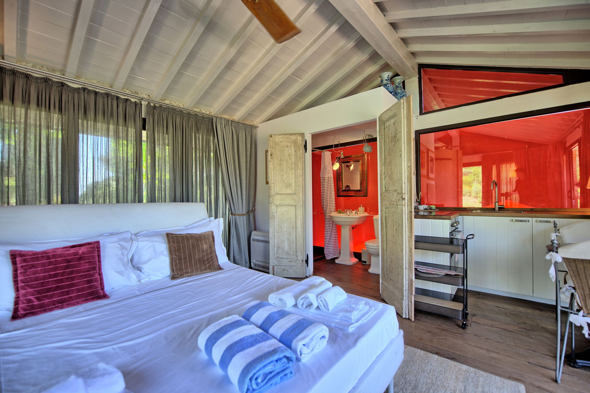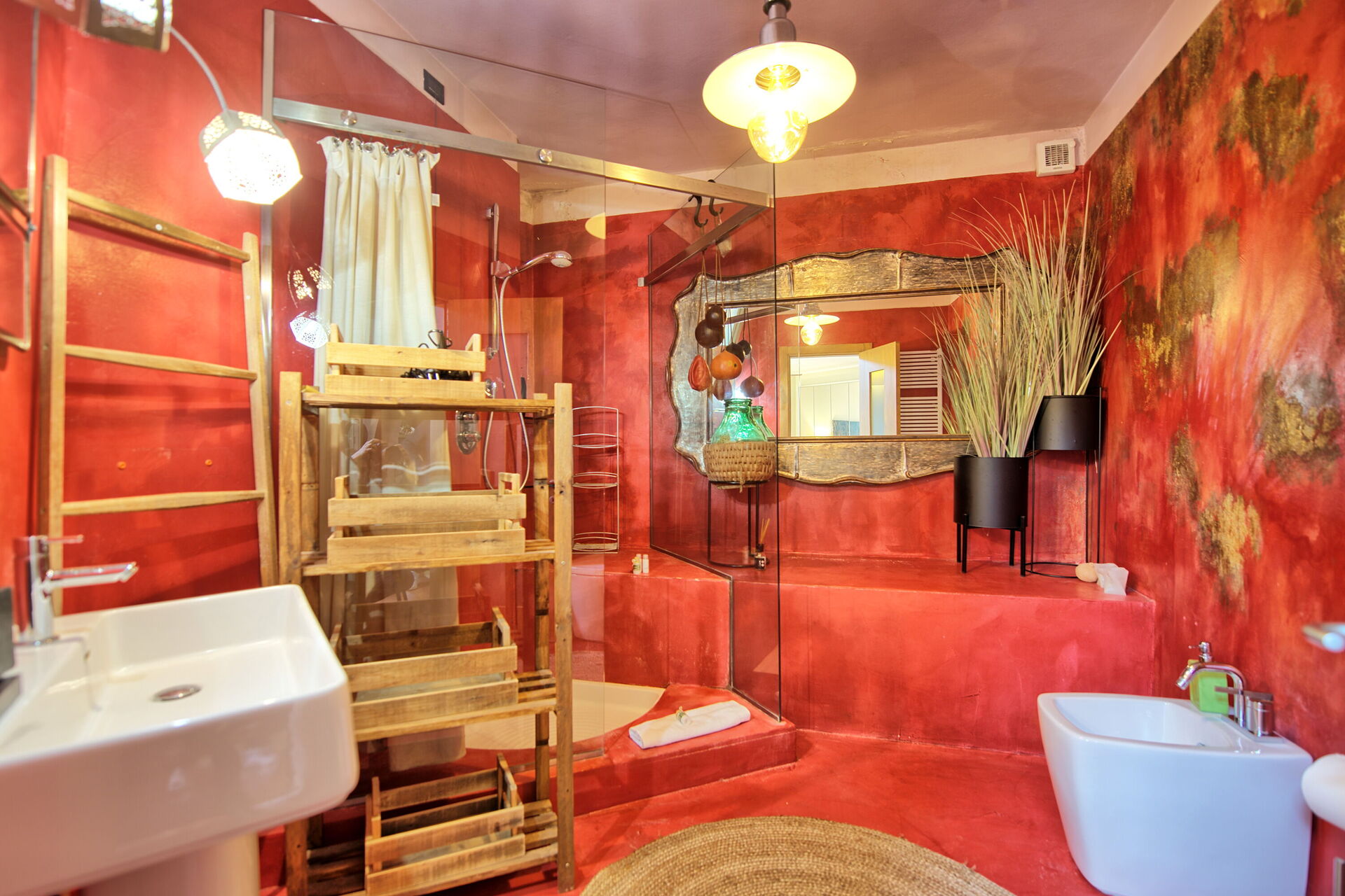 Rez-de-chaussée: chambre double (air conditionné et ventilateur de plafond) avec salle de bain privée avec douche.