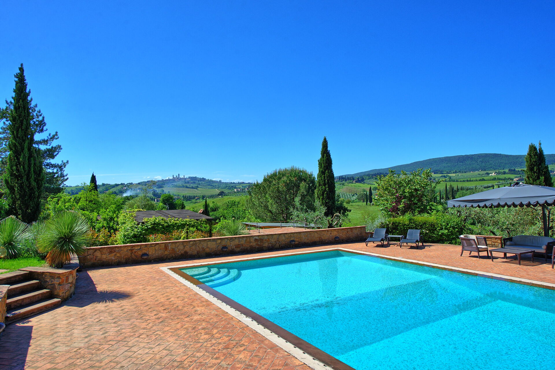La piscine se trouve sur une grande pelouse et offre une vue sur les collines de Toscane et les tours médiévales de la ville historique de San Gimignano. La piscine est entourée d'un solarium et d'un jardin luxuriant.