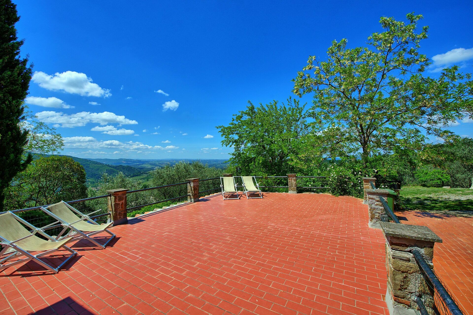 3 marches plus haut: accès à une grande terrasse panoramique privée clôturée, équipée de mobilier de jardin.