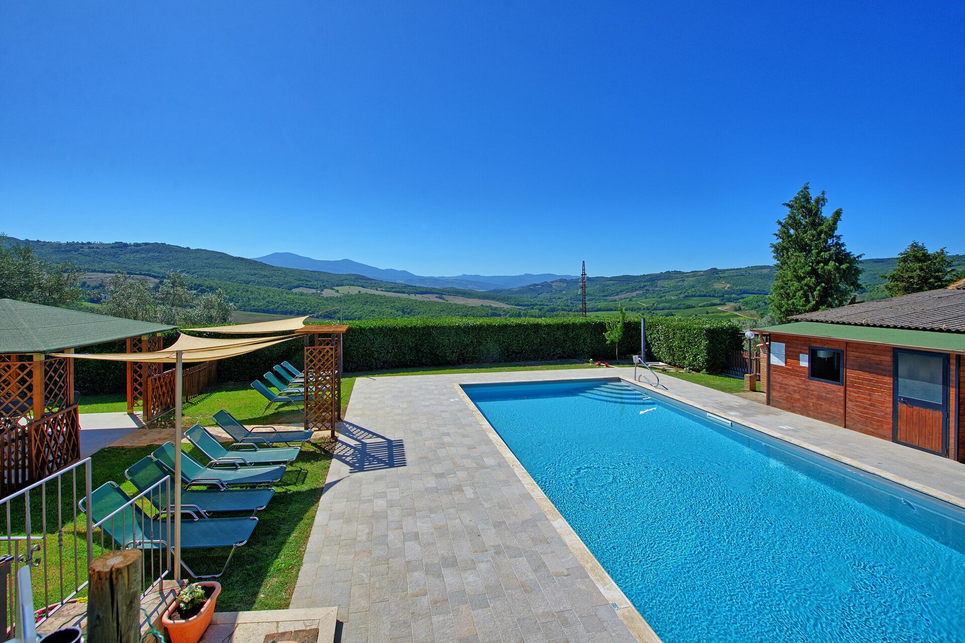 Villa Cerretalta est entourée d’une haie et d’une barrière en bois pour garantir une position tranquille sans nuire à la belle vue sur la campagne toscane.