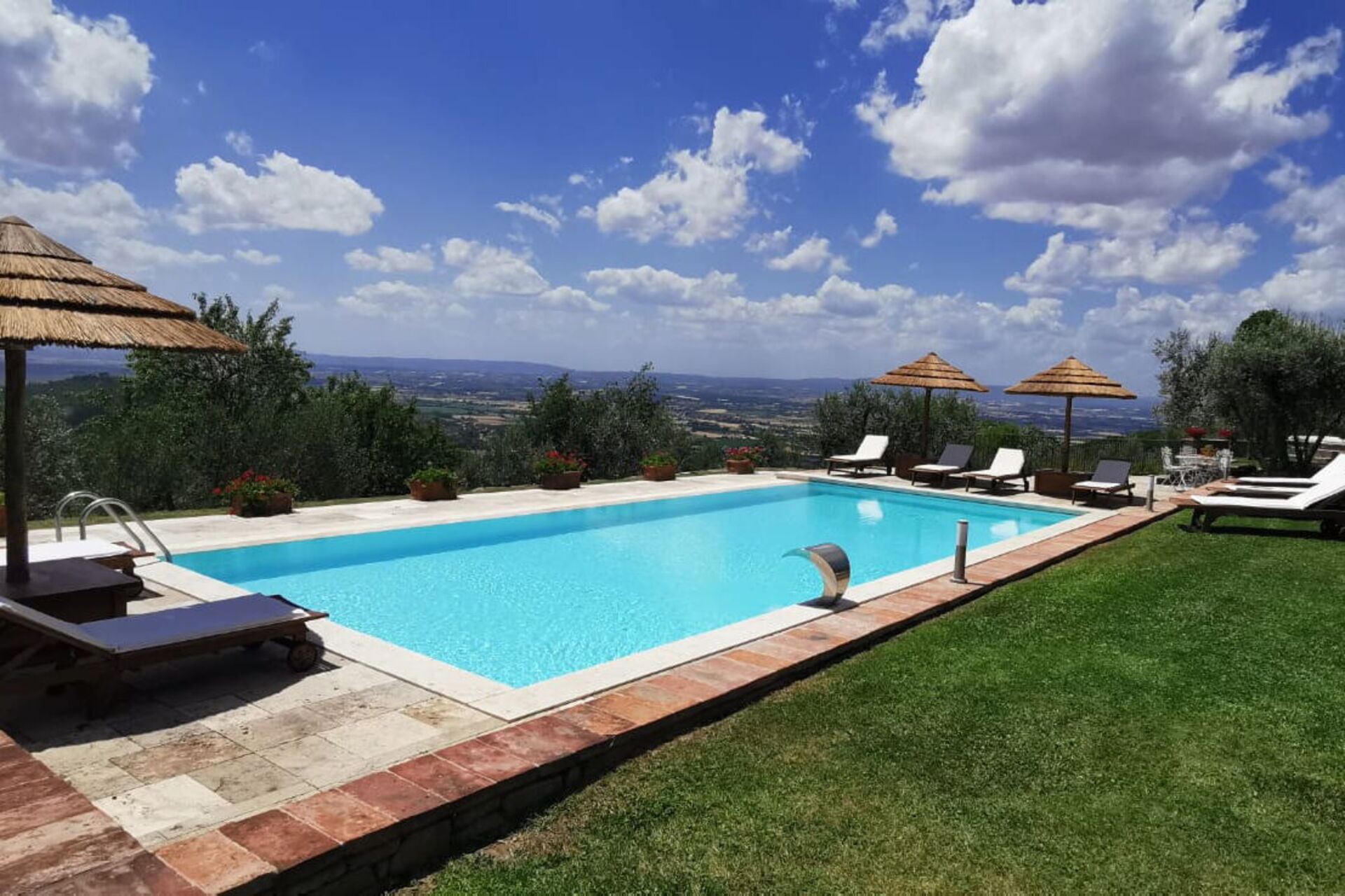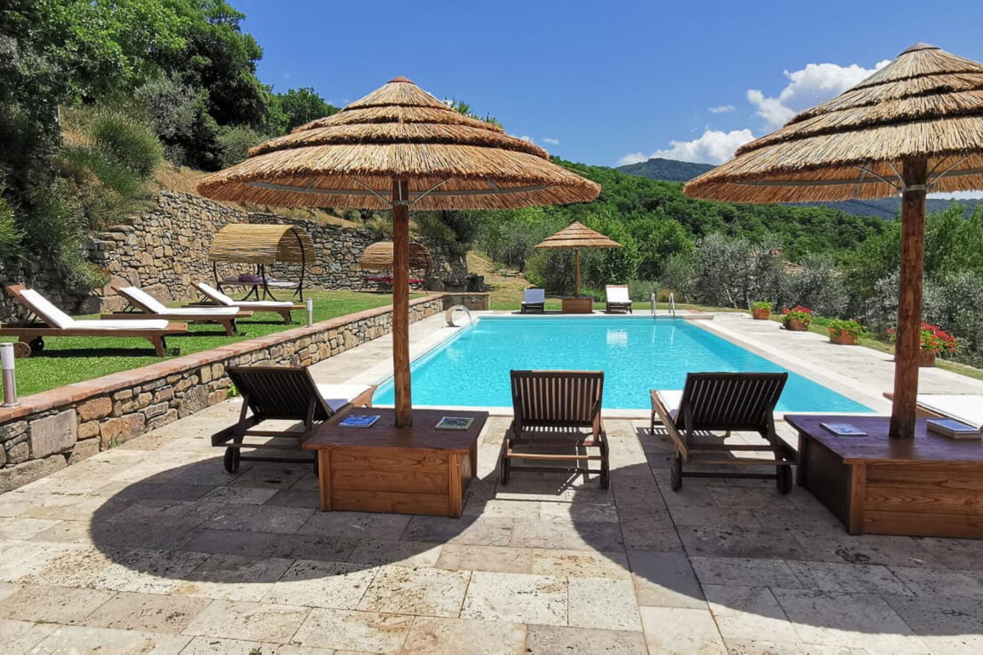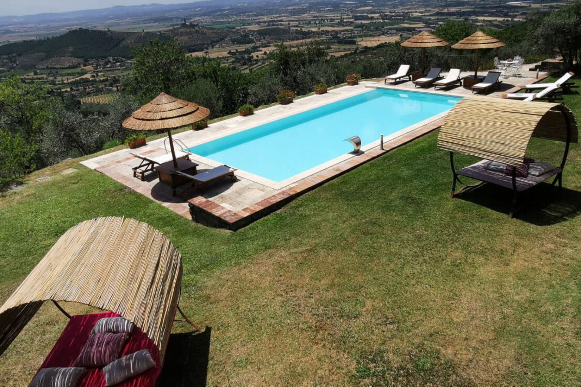 Un grand jardin bien entretenu offre espaces verts et terrasses. Piscine en position panoramique et surélevée par rapport à la villa distante quelques mètres.
