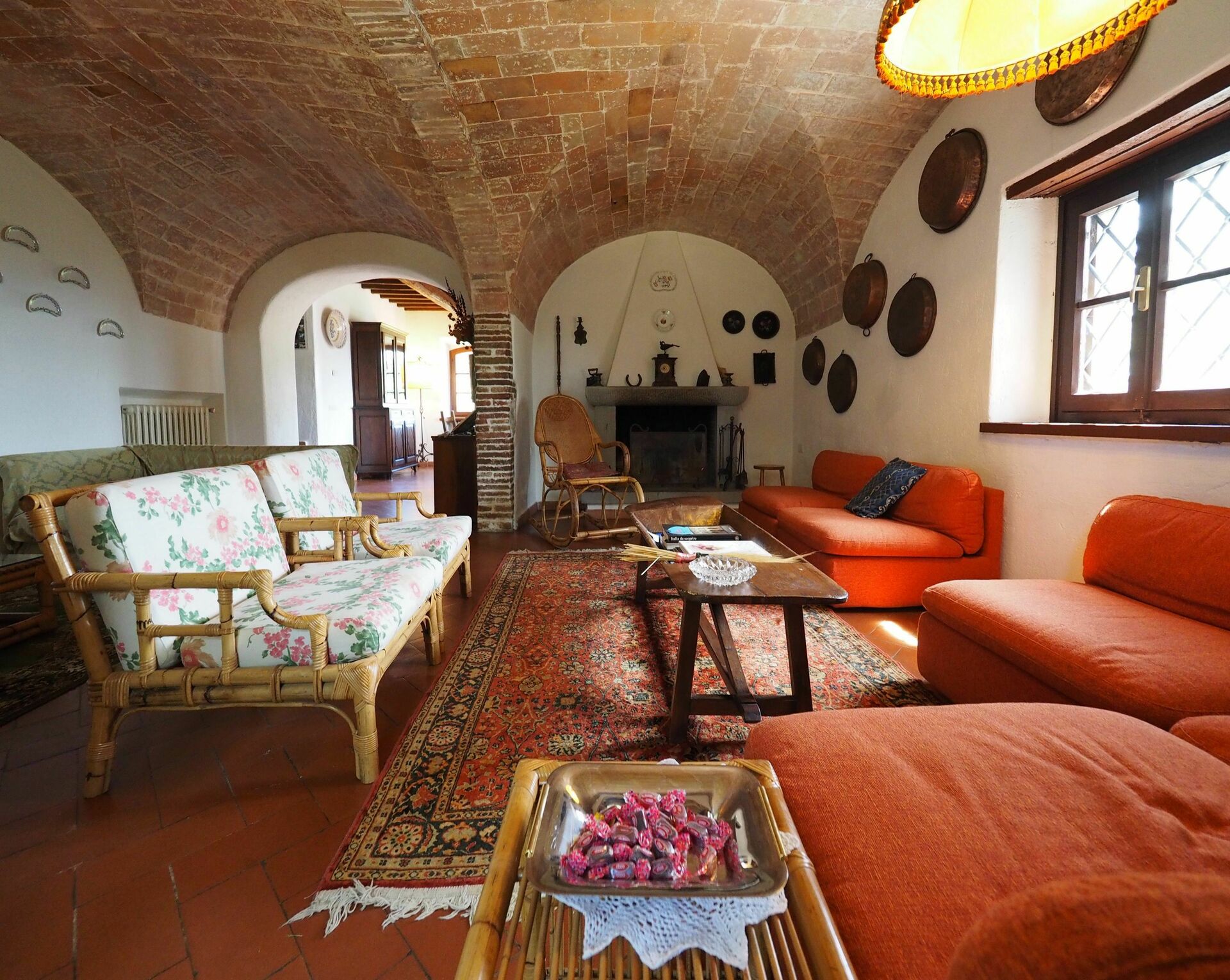 Rez-de-chaussée: grand séjour avec divans et fauteuils, belle salle à manger, 3 marches plus en haut accès à une grande cuisine bien équipée (four, freezer, lave-vaisselle, grille-pain, machine à café) avec grande cheminée ouverte idéale pour grillades, véranda utilisée comme office avec accès à une grande terrasse équipée avec table et chaises. 2 marches plus en haut: salle de bains de service.