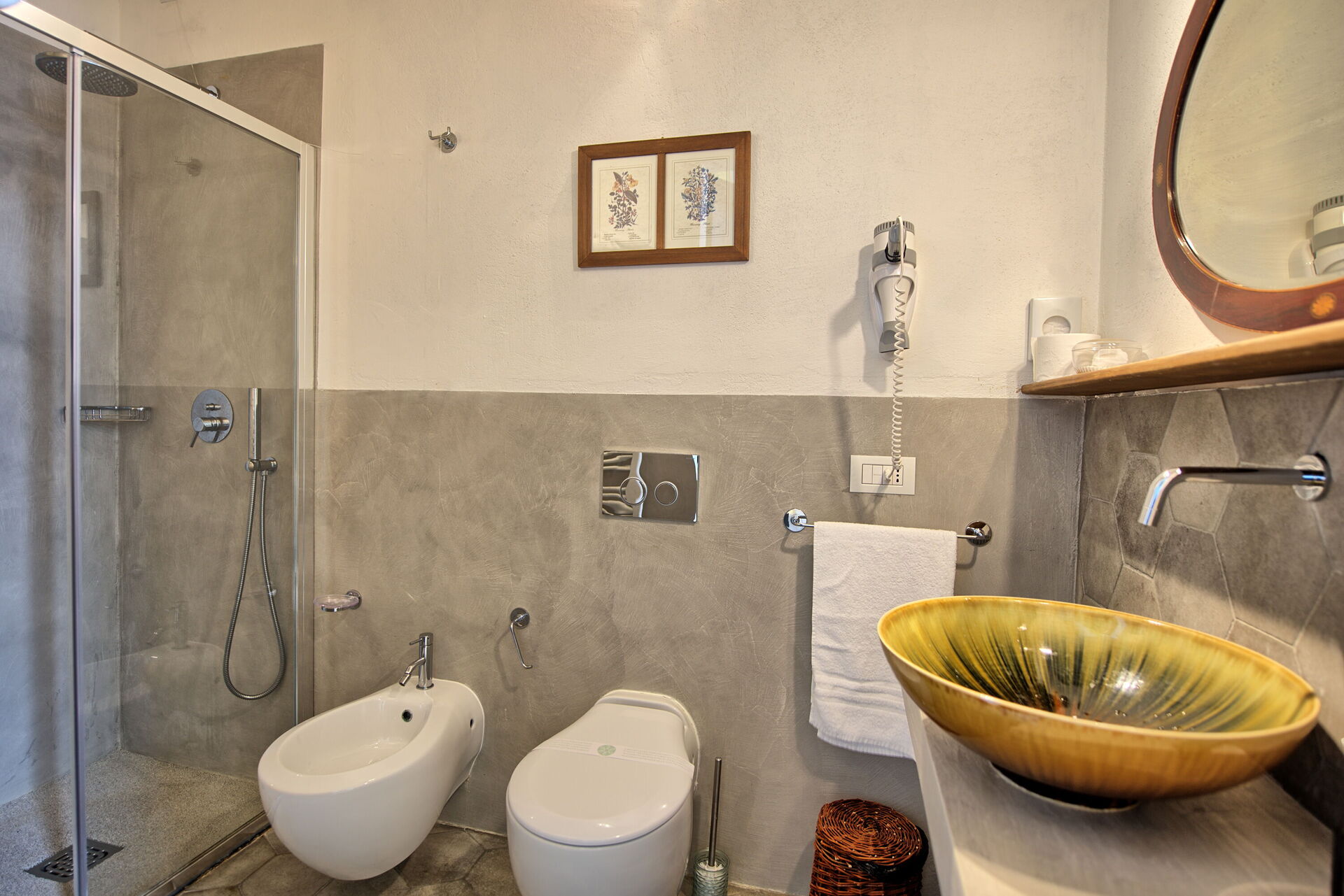 1er étage : petit séjour et kitchenette, salle de bain avec douche, chambre (climatisée) avec lit double et lit simple avec salle de bain privée avec douche, chambre double (climatisée) avec vue panoramique, salle de bain privée avec douche.
