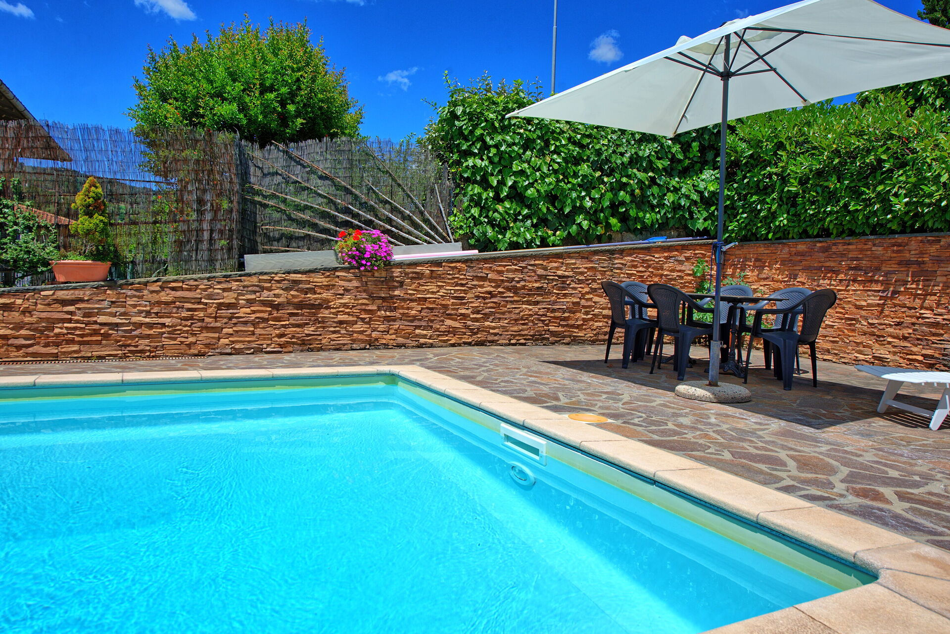À l'extérieur, la piscine privée (ouverte du 15 avril au 15 octobre) est équipée d'un système de purification au sel et mesure 8 mètres x 4 mètres. Elle est entourée d'un solarium avec chaises longues, coin repas et douche extérieure (eau chaude). Des jardins clôturés bien soignés et des arbustes typiques de la région entourent la villa. Pour la commodité des hôtes, le terrain est entièrement clôturé et un parking privé est disponible.