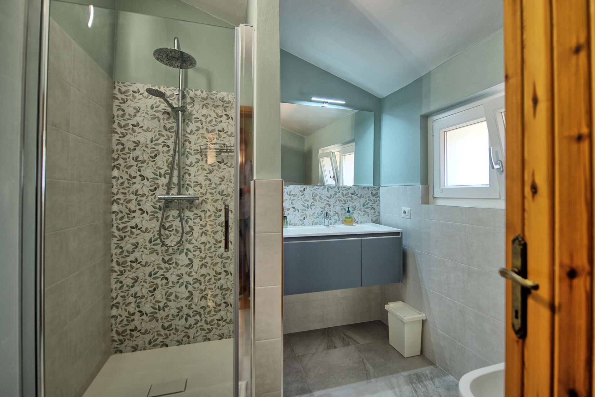 Un escalier conduit à l'étage supérieur, où se trouvent deux chambres (une chambre double et une chambre à deux lits) et une salle de bains avec douche.