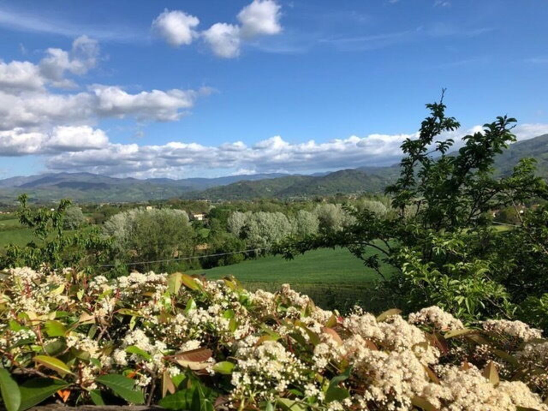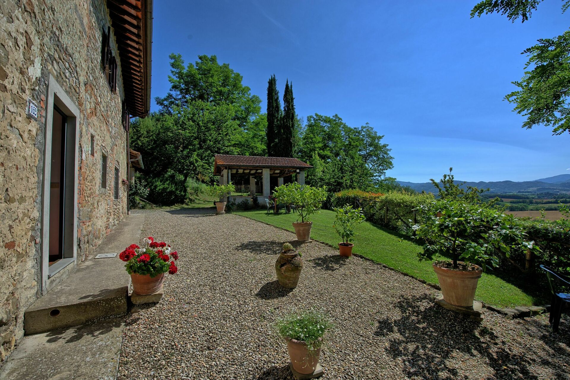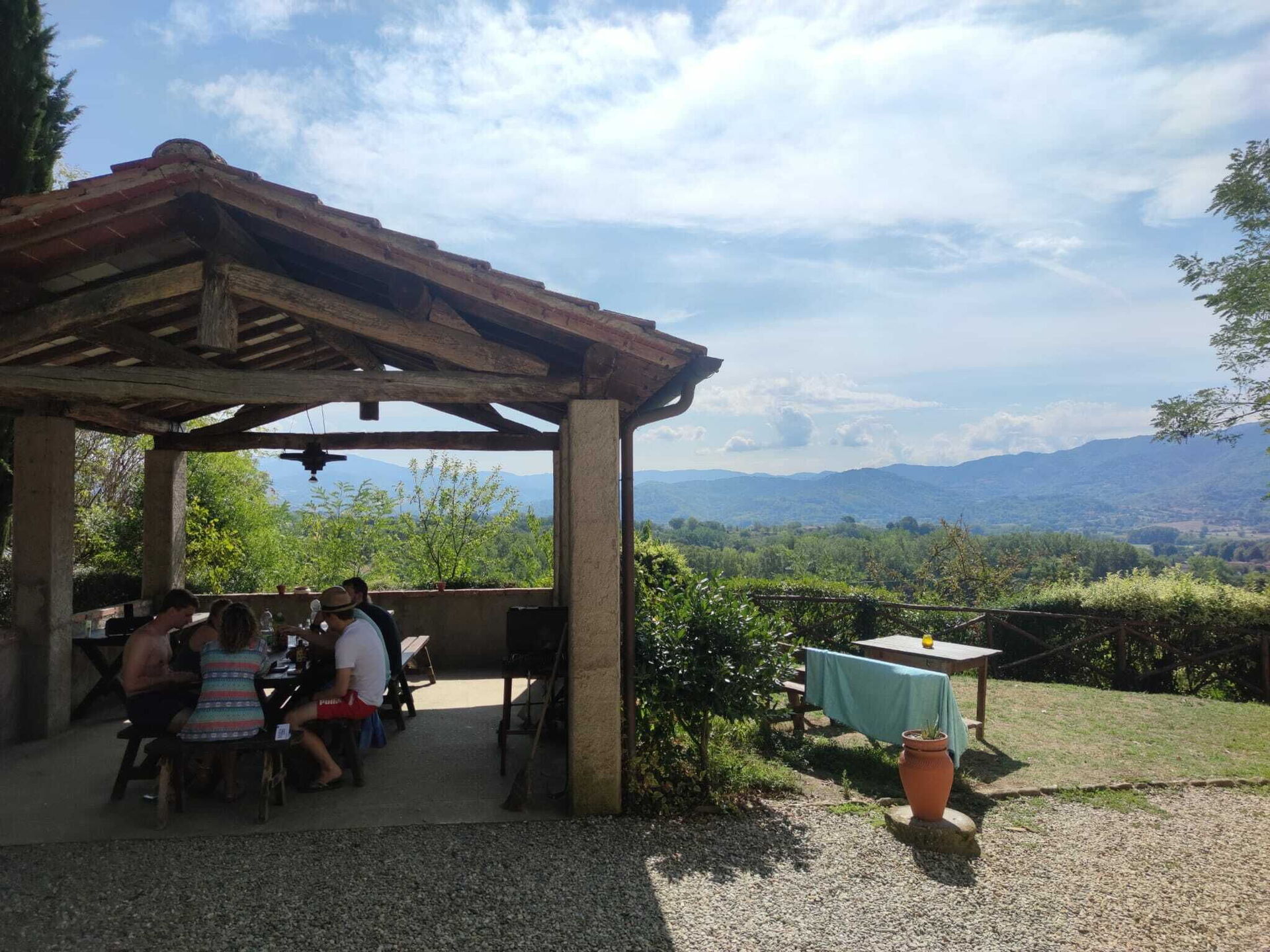 A l’extérieur, une belle zone équipée pour les repas d’où l’on jouit d’une très belle vue sur les collines toscanes et le mont Falterona dans les Apennins où prend sa source le fleuve Arno.