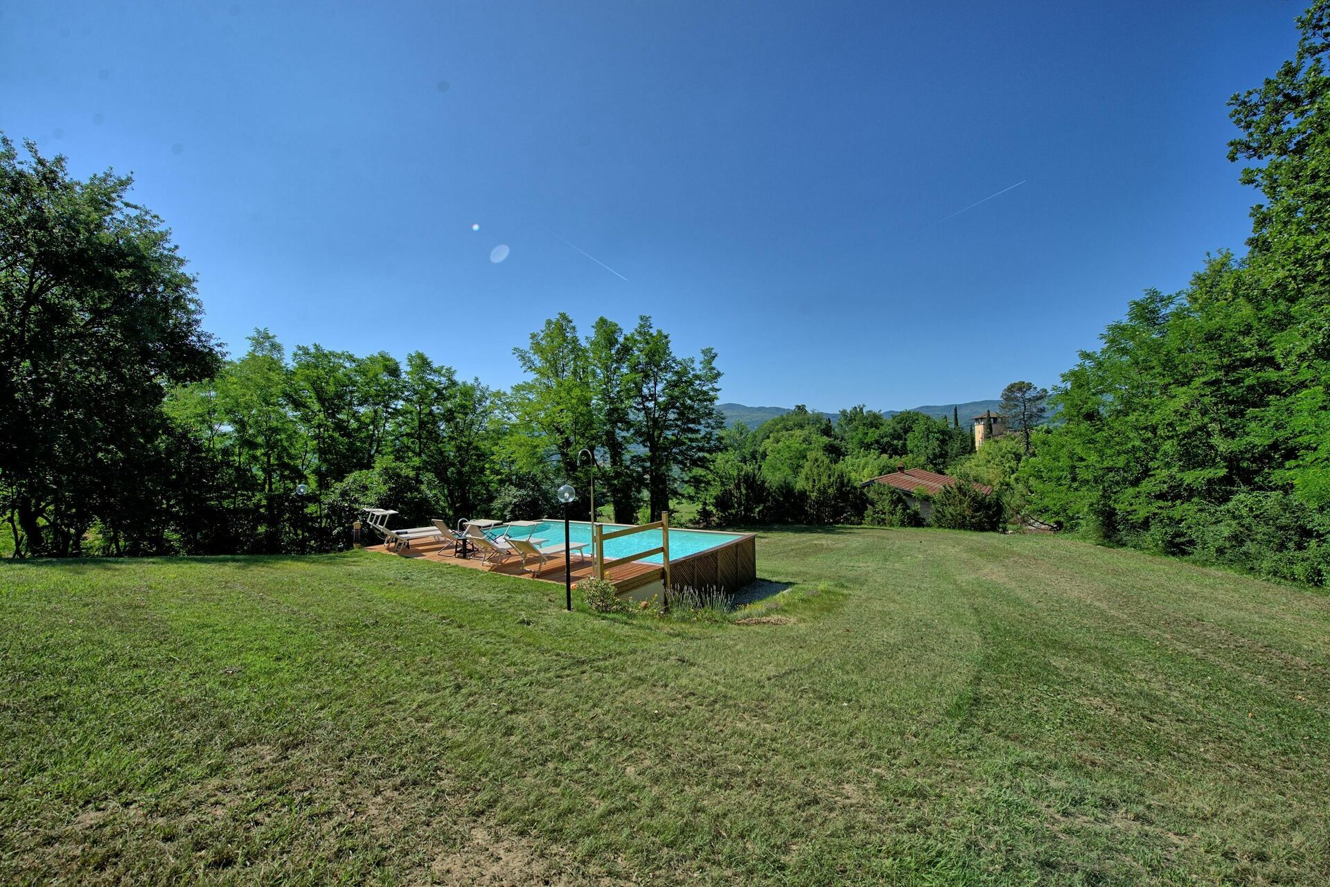 La piscine privée de cette maison en location en Toscane se trouve dans un beau jardin situé à un niveau supérieur par rapport à la maison et d’où l’on jouit d’une vue panoramique.