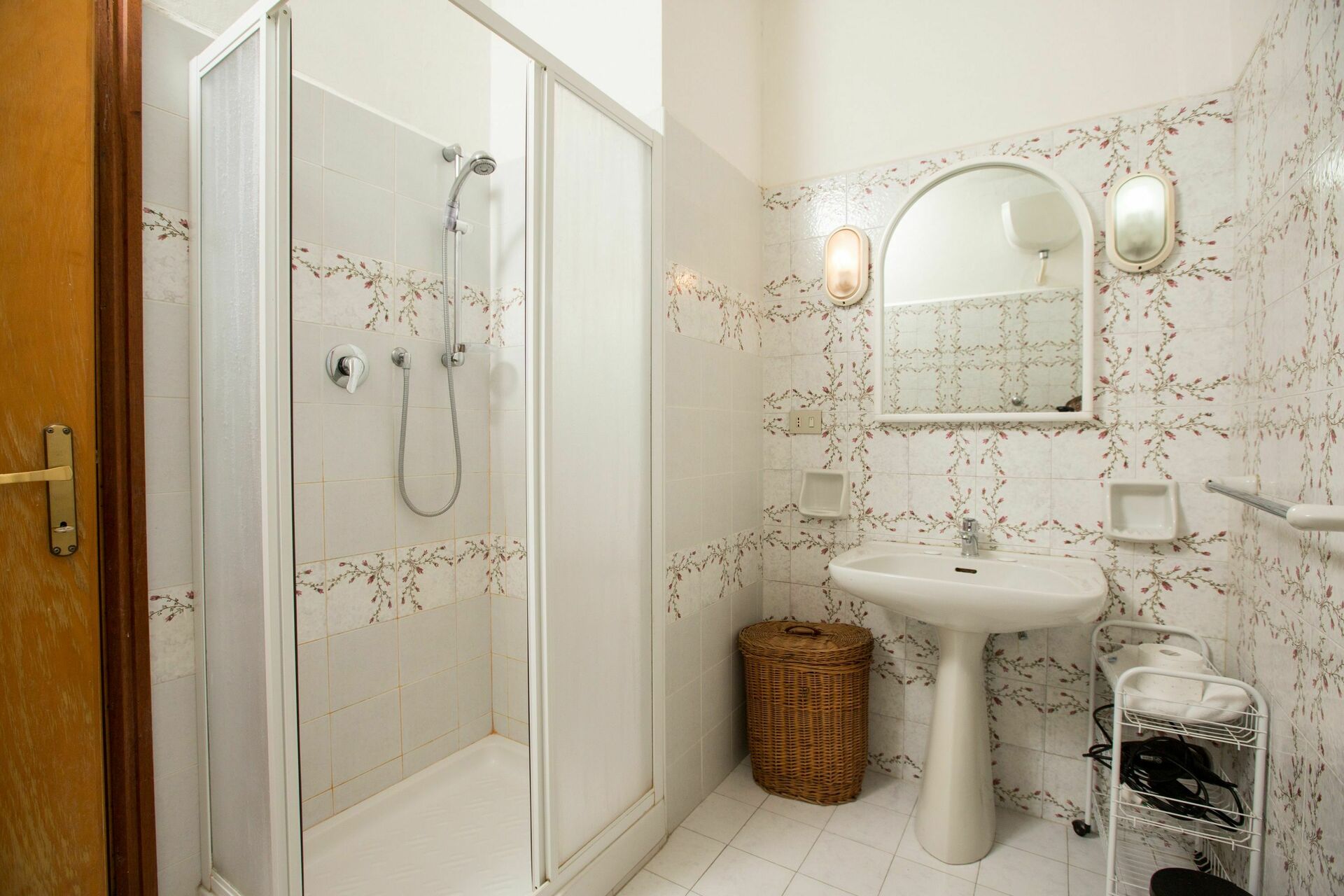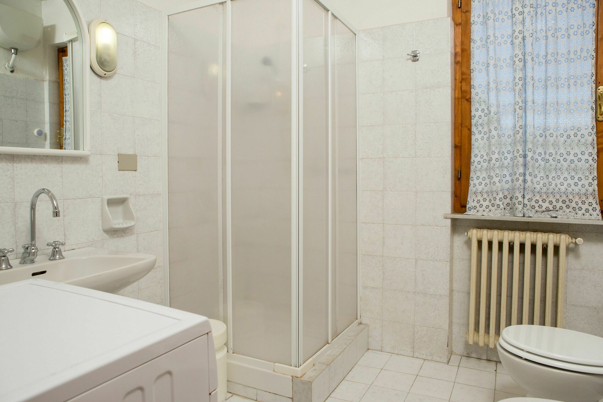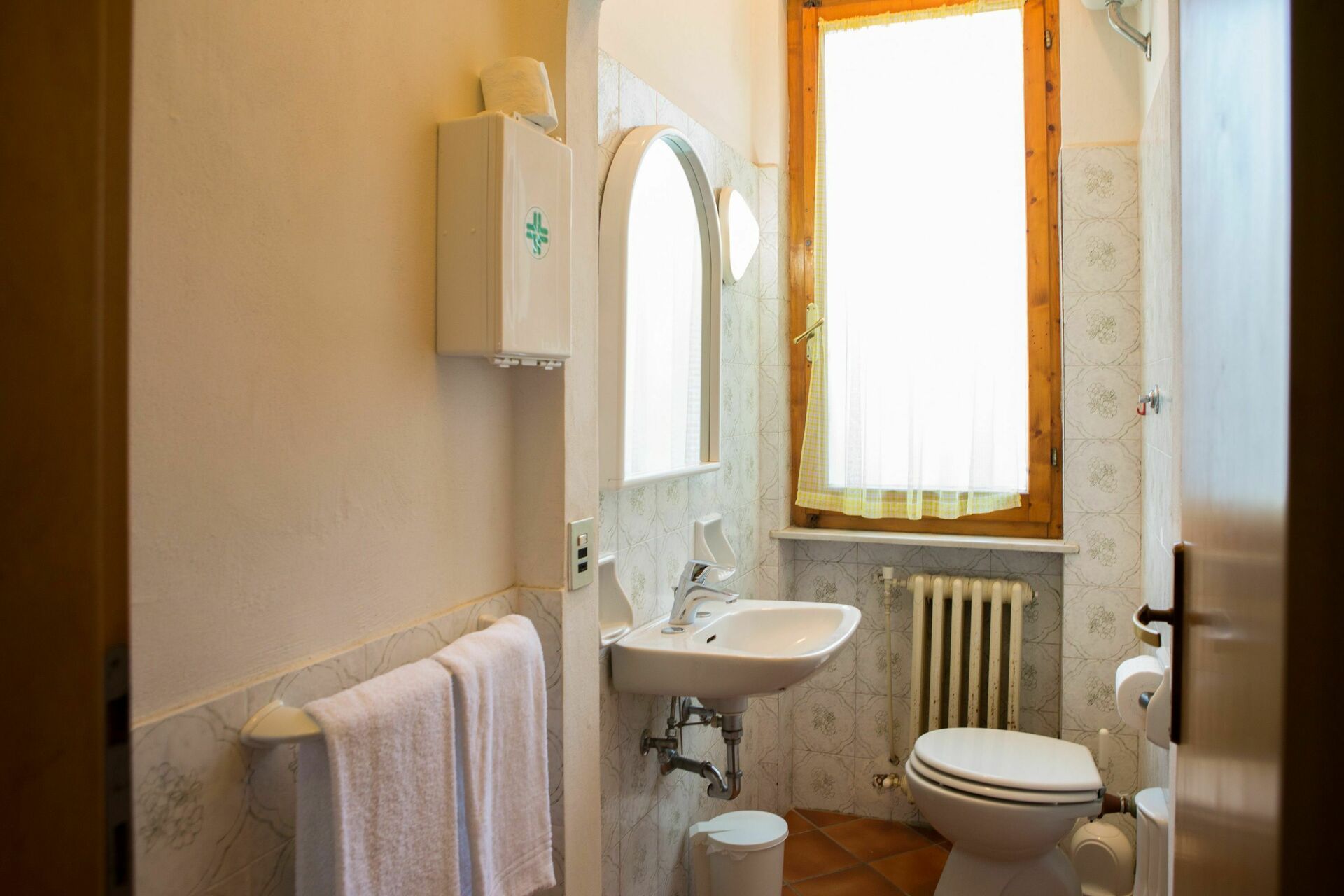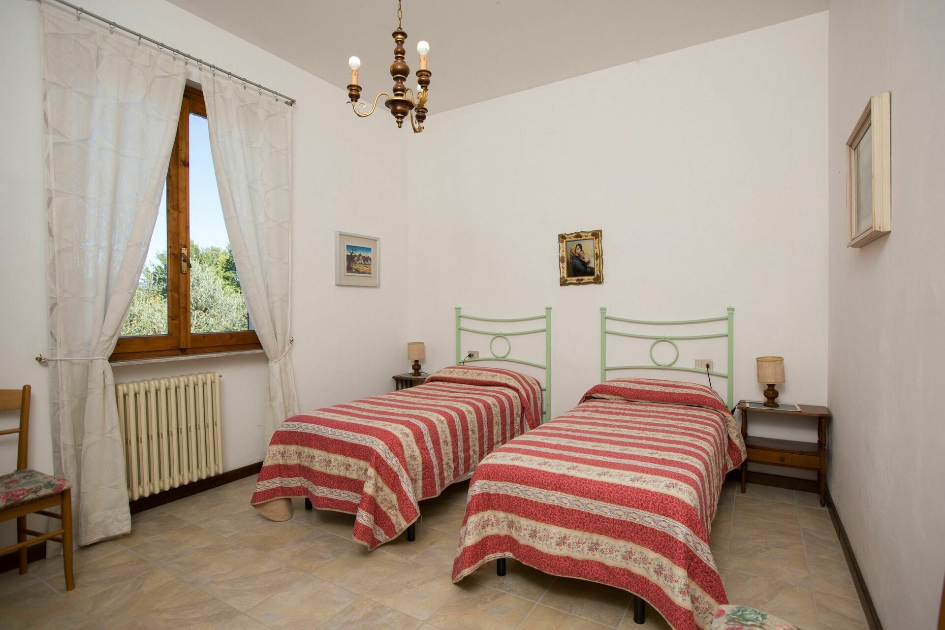 Premier étage : 2 chambres doubles, 2 chambres avec 2 lits à une place, 3 salles de bains avec douche dont une avec lave-linge. Toutes les chambres ont accès sur un long balcon commun d’où l’on jouit d’une belle vue sur la Valdelsa.