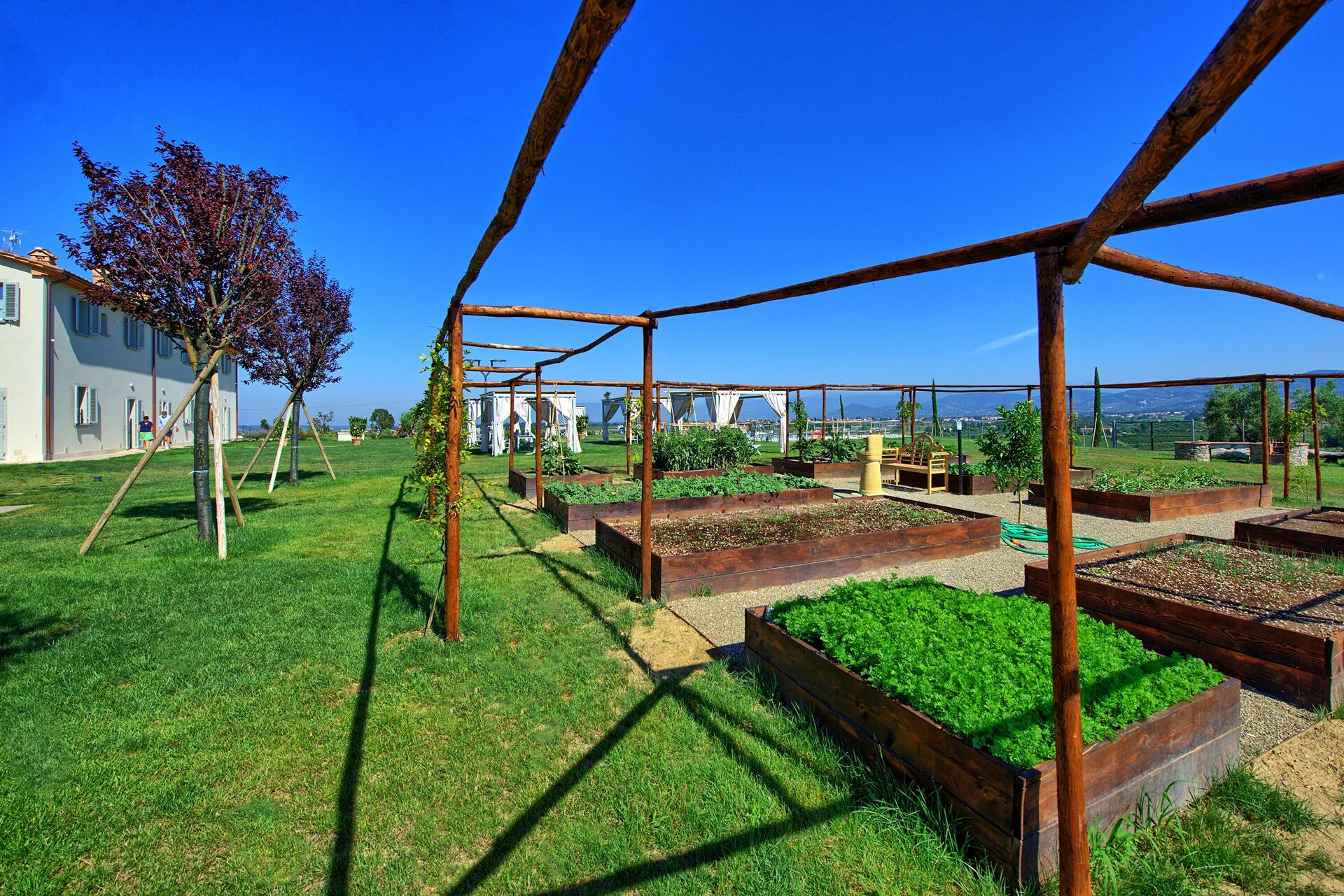 We had a very nice stay at Il Sole Di Vino - it is such a beautiful and peaceful palce, located in the middle of wine yards in Tuscany, around an hour away from Florence. What we enjoyed: il Sole de Vino offers five nice guest flats in an old building, fully and brand new renovated (and with a top standard!) on top of a hill with a nice view over the wine yards. On the huge area has every of the five flats an own pavillion (a gazebo) in which you can be on your own, eat drink, sit in the sun, or be in contact with others, if you like. The whole atmosphere also with the pool is more like a small private club. Lorenzo and Martina, the owners, are living on the ground as well and are taking very much care of their guests and maintain the whole area very well - it is all in a top condition, Martina and Lorenzo are really nice and friendly people. Especially for families with children Il Sole de Vino is excellent, children can play there (also with others), the pool with the view over the valleys is really beautiful as well. Martina and Lorezo are having a small garden where guests can harvest cucumbers, tomatoes, melons or zucchinis for cooking.