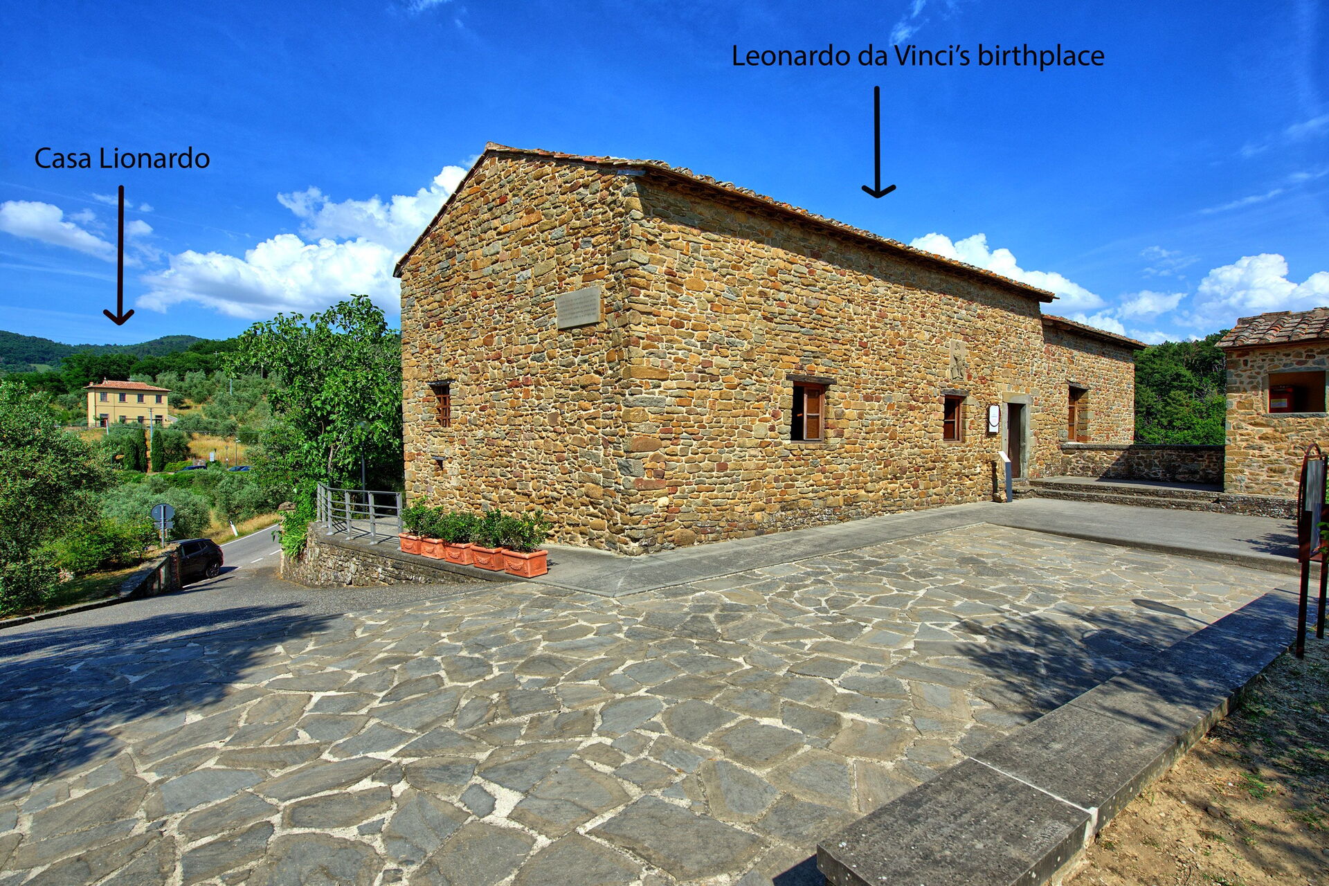 Distances: maison où est né Léonard de Vinci à 150 mètres; Vinci (magasins de toutes sortes et Musée Léonard de Vinci) à 2,5 km, Florence à 40 km, San Gimignano à 50 km, Pise à 60 km, mer (Versilia: côte toscane) à 75 km, Sienne à 85 km, Arezzo à 120 km.