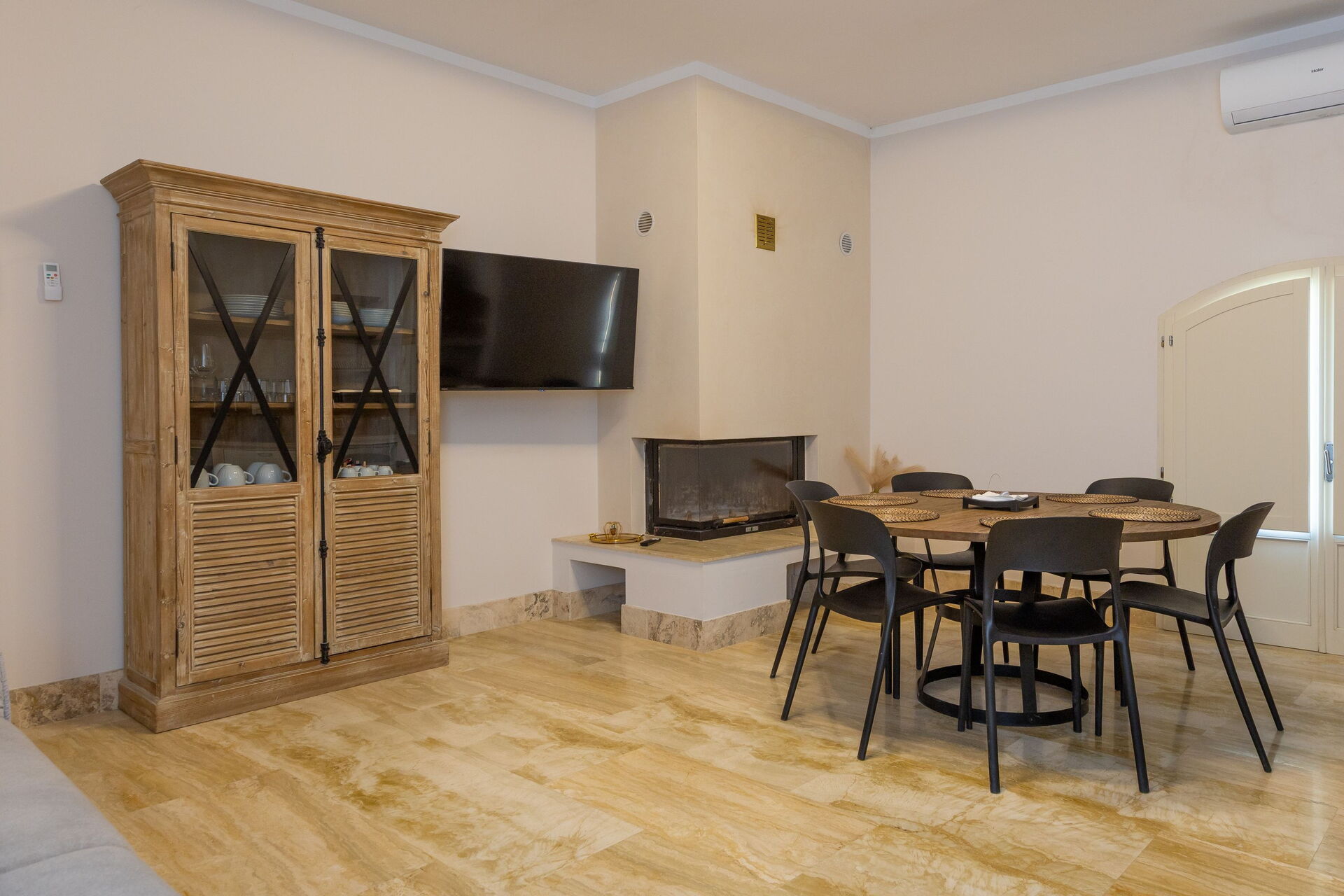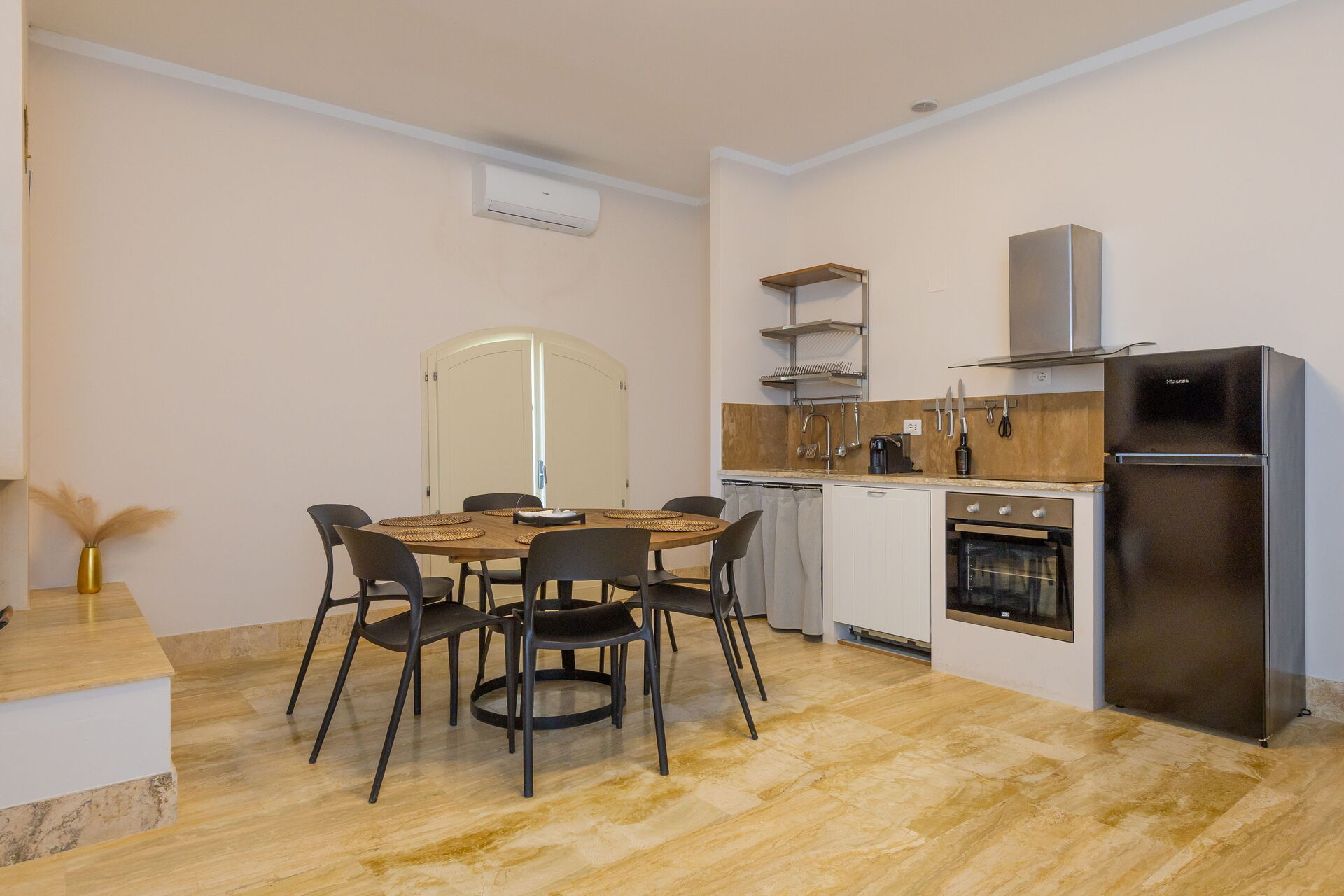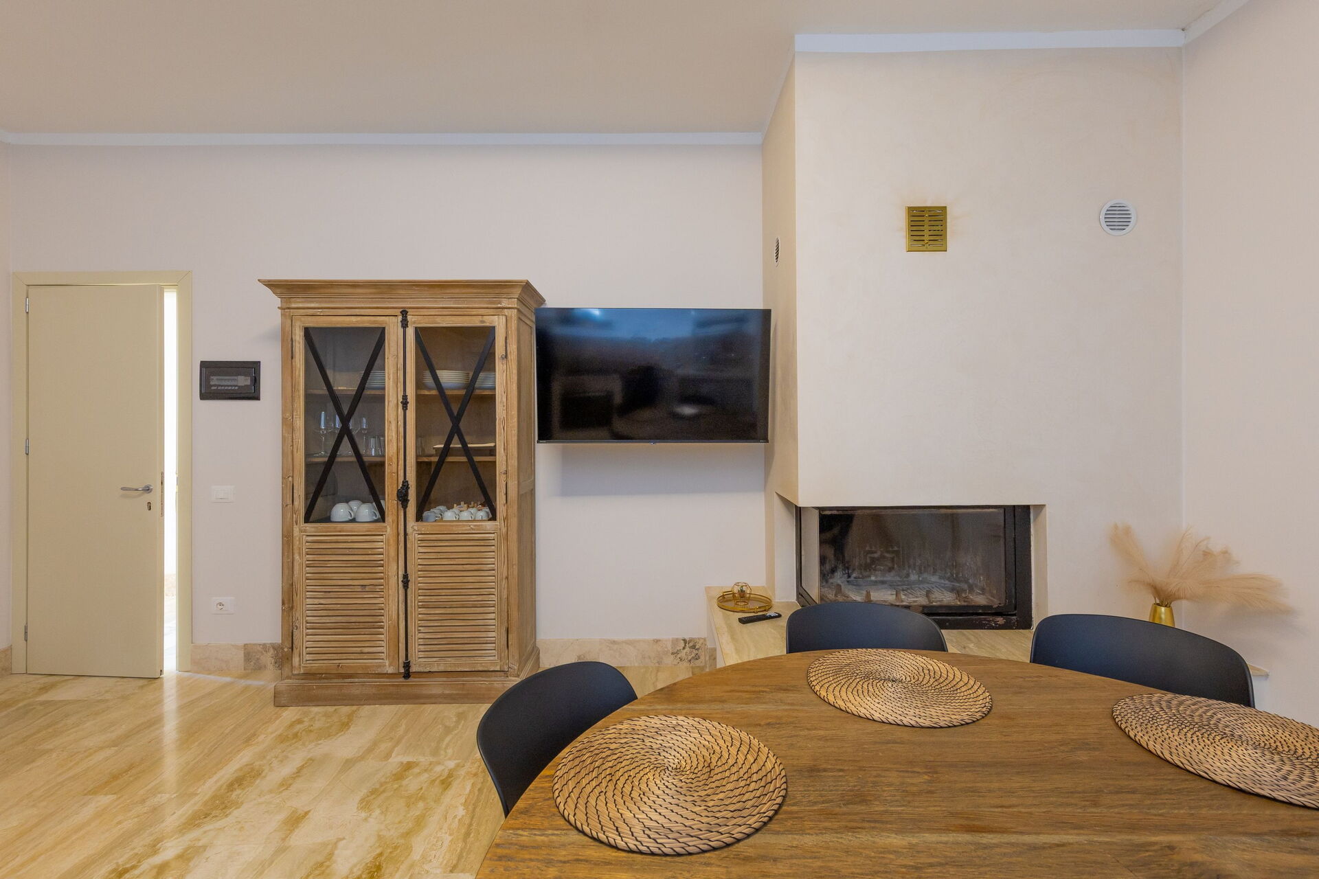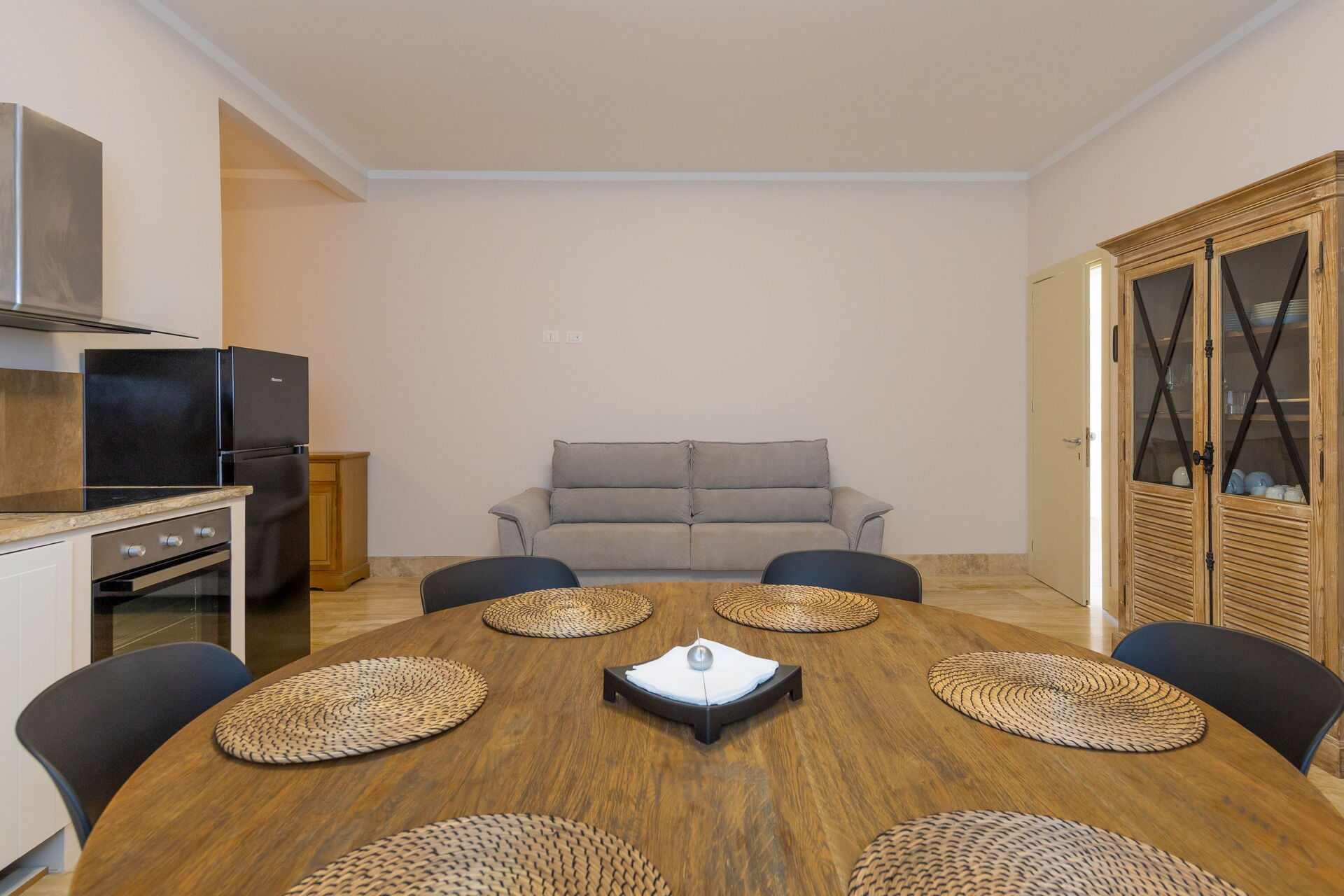Premier étage: salon (smart TV, air conditionné) avec canapé-lit double, coin repas et kitchenette (lave-vaisselle, four, réfrigérateur, machine à café expresso, grille-pain), 2 chambres doubles (chacune avec air conditionné), salle de bain avec douche.