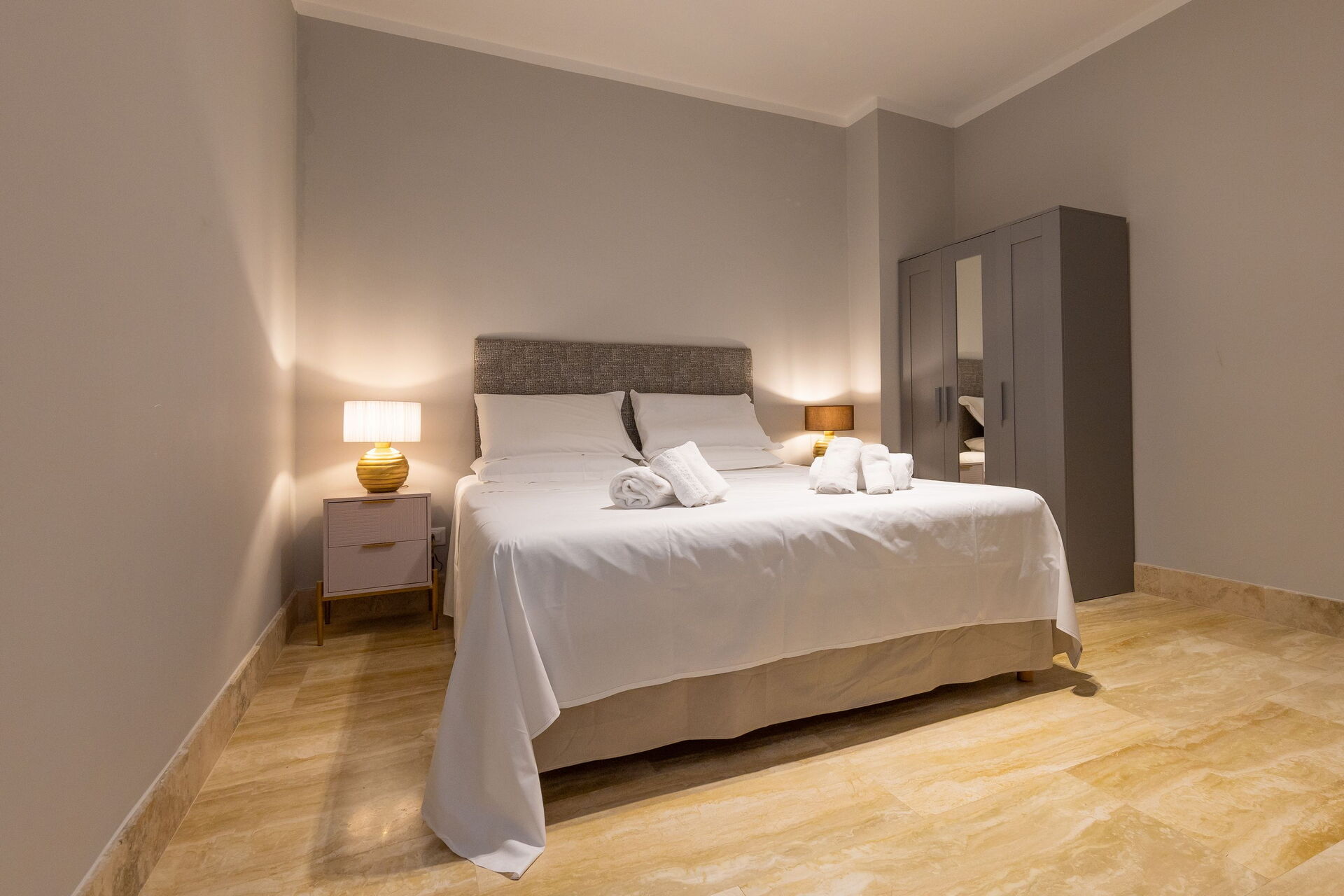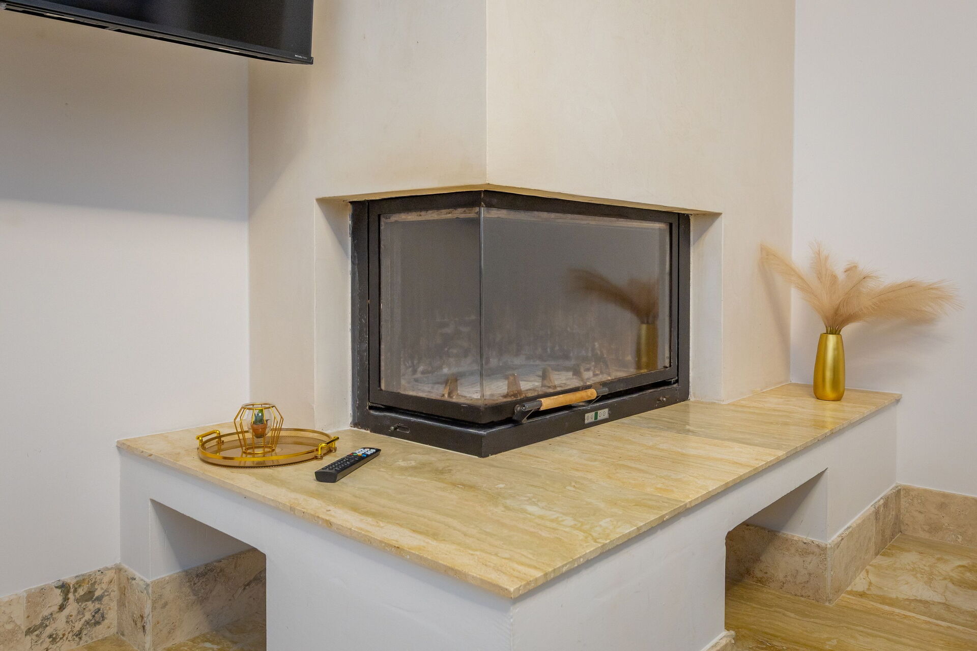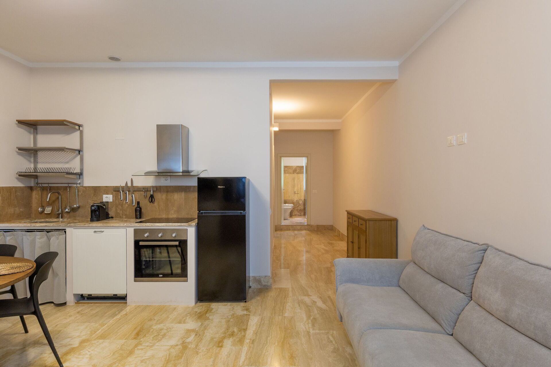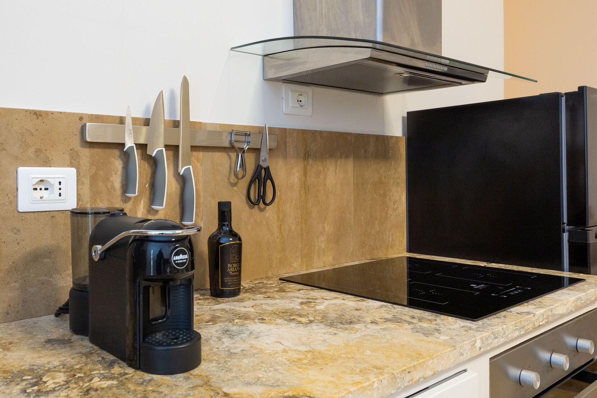 Premier étage: salon (smart TV, air conditionné) avec canapé-lit double, coin repas et kitchenette (lave-vaisselle, four, réfrigérateur, machine à café expresso, grille-pain), 2 chambres doubles (chacune avec air conditionné), salle de bain avec douche.