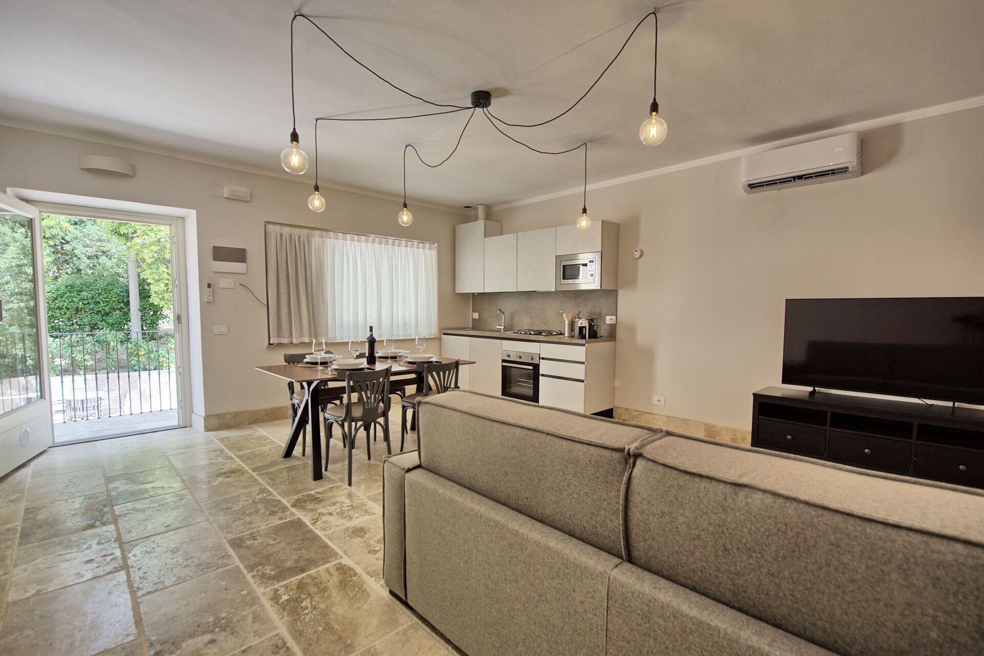Rez-de-chaussée surélevé: salon (smart TV, air conditionné) avec canapé-lit double, coin repas et kitchenette (lave-vaisselle, four, réfrigérateur, machine à café expresso, grille-pain), chambre double (air conditionné), salle de bain avec douche.