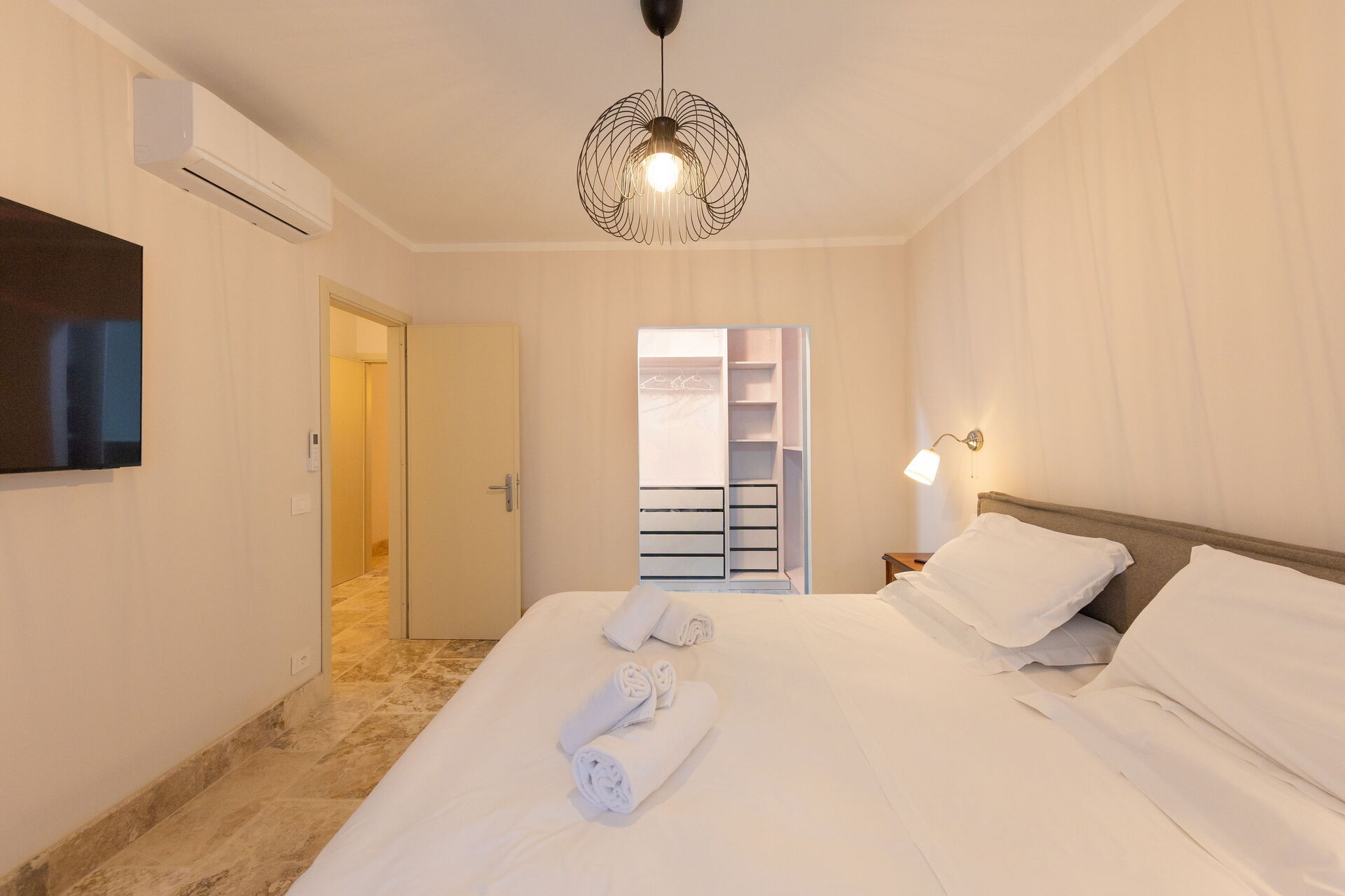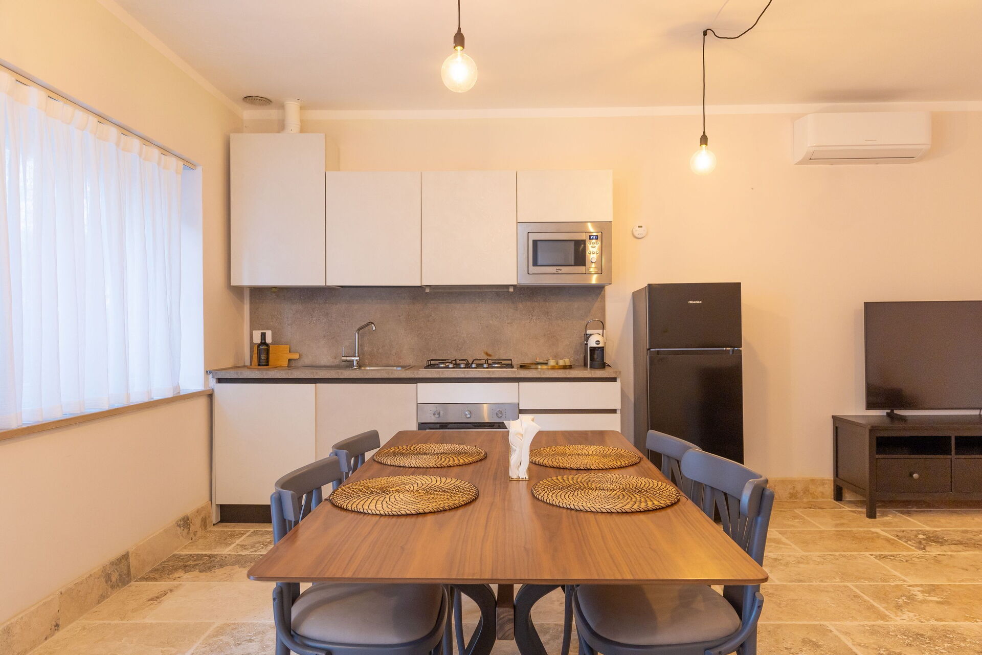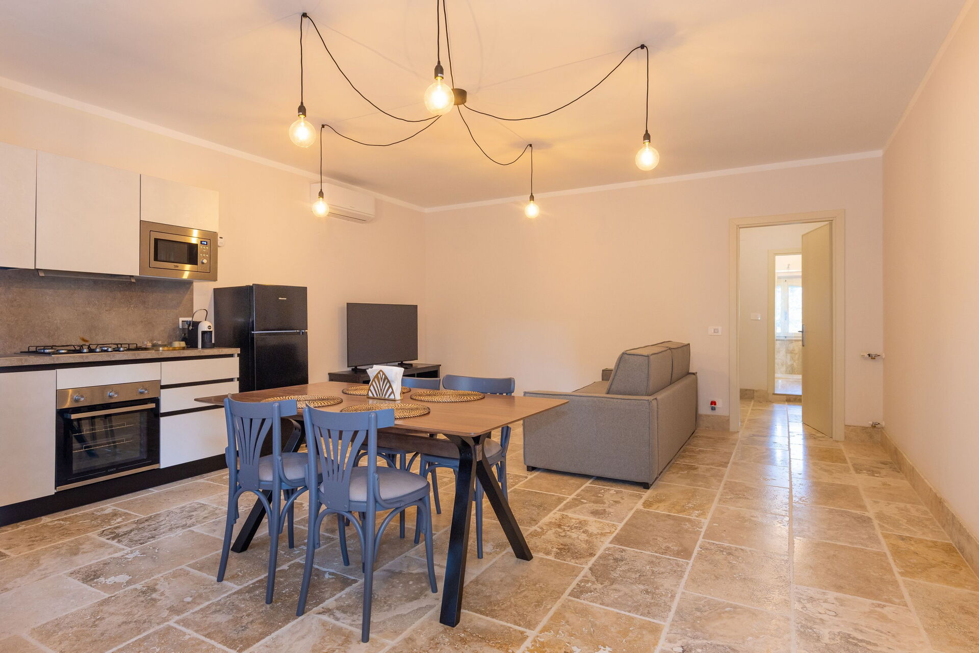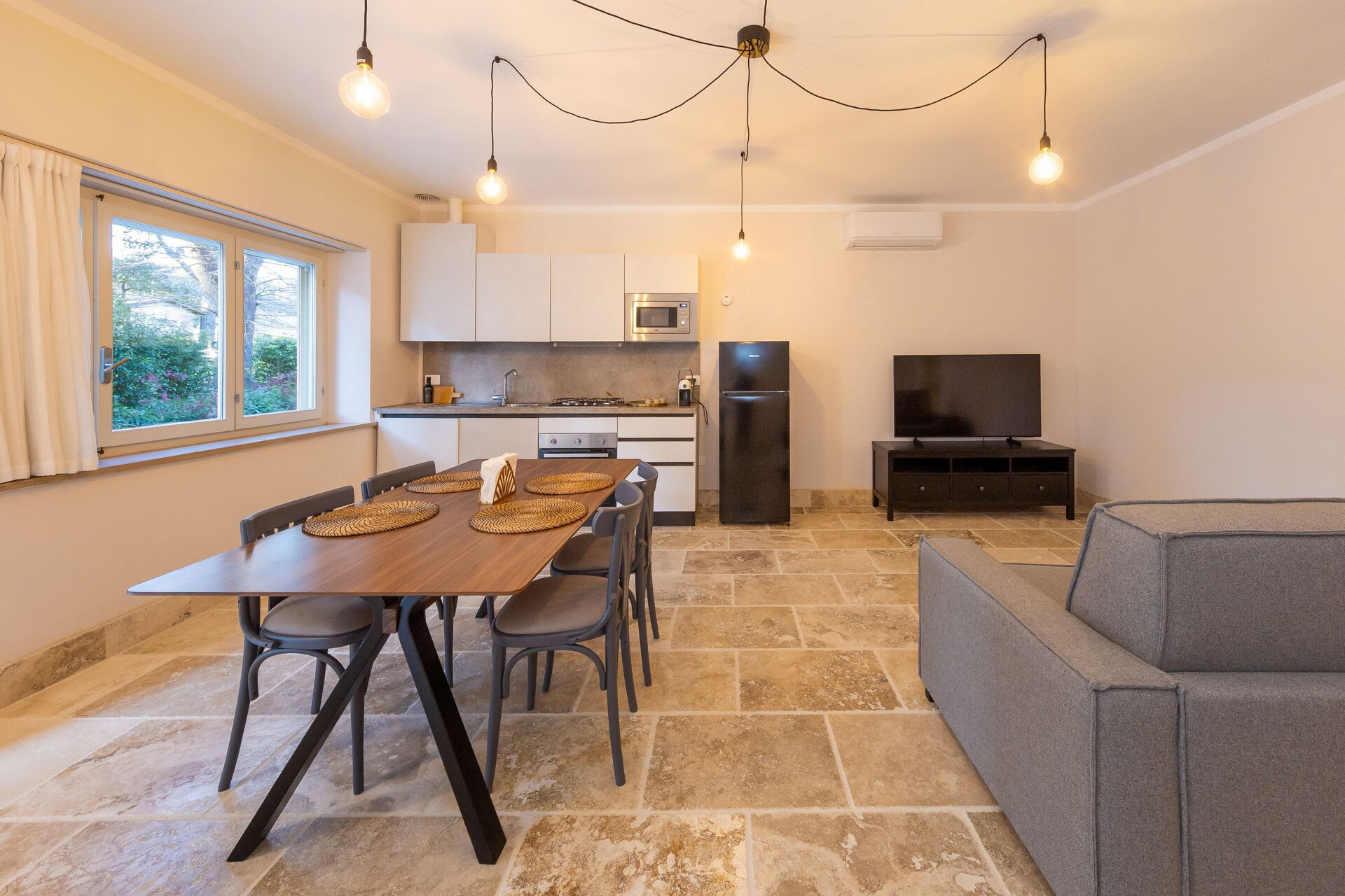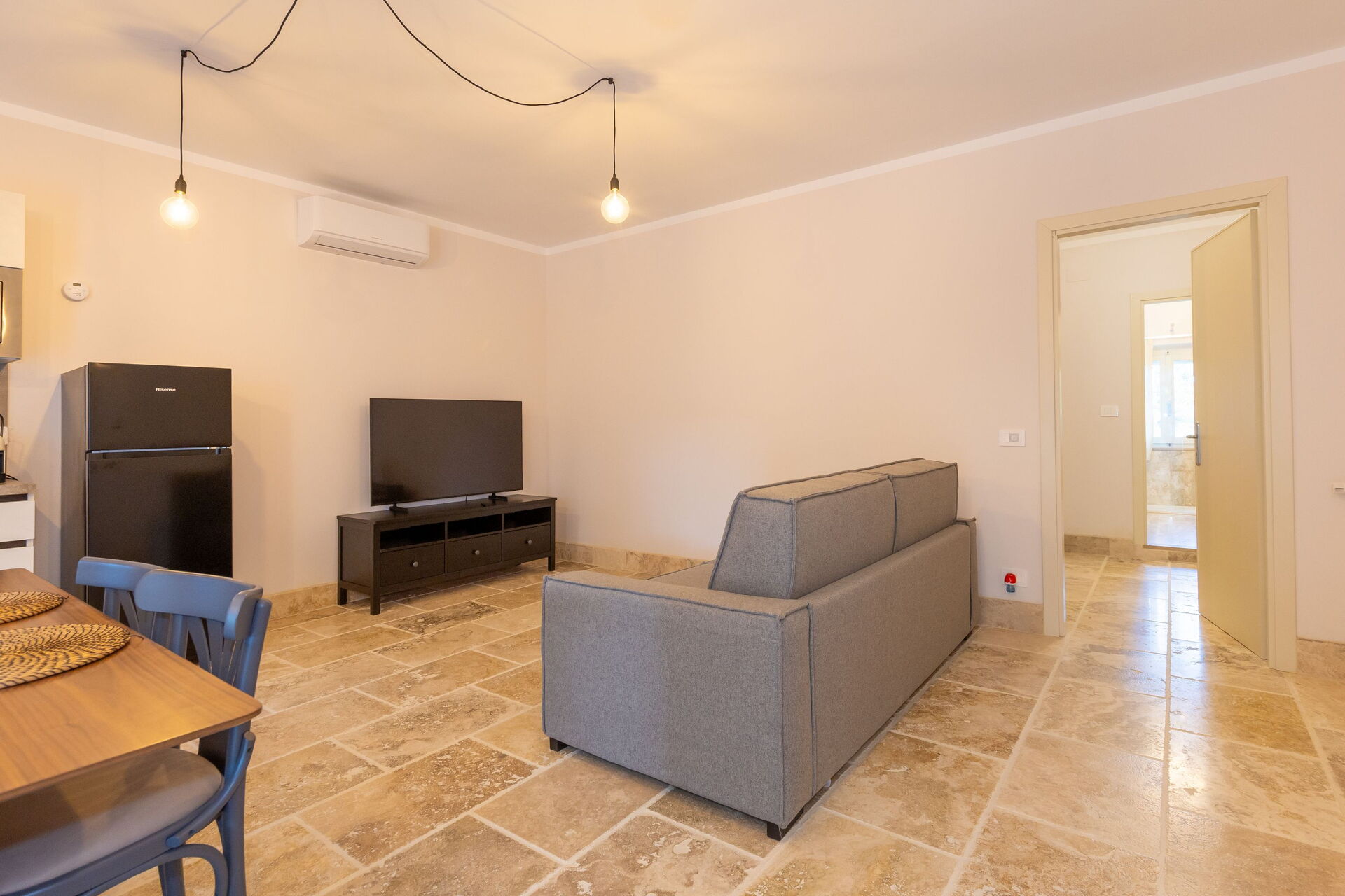 Rez-de-chaussée surélevé: salon (smart TV, air conditionné) avec canapé-lit double, coin repas et kitchenette (lave-vaisselle, four, réfrigérateur, machine à café expresso, grille-pain), chambre double (air conditionné), salle de bain avec douche.