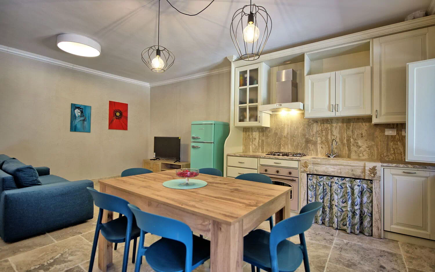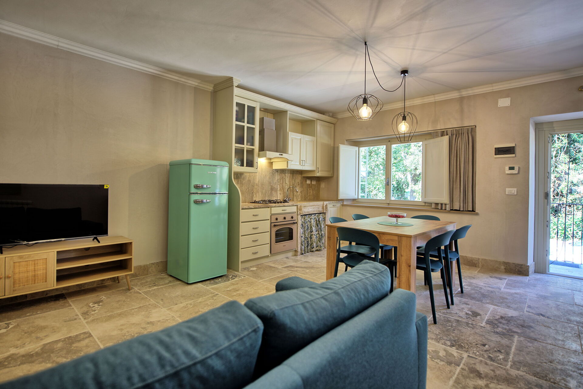 Rez-de-chaussée surélevé: salon (smart TV, air conditionné) avec canapé-lit double, coin repas et kitchenette (lave-vaisselle, four, réfrigérateur, machine à café expresso, grille-pain), chambre double (air conditionné), salle de bain avec douche.