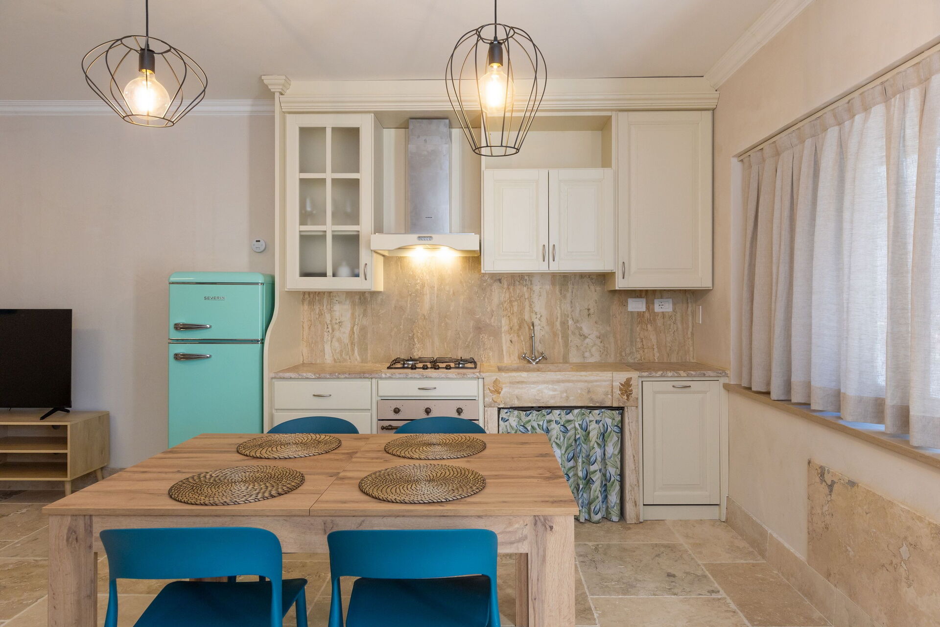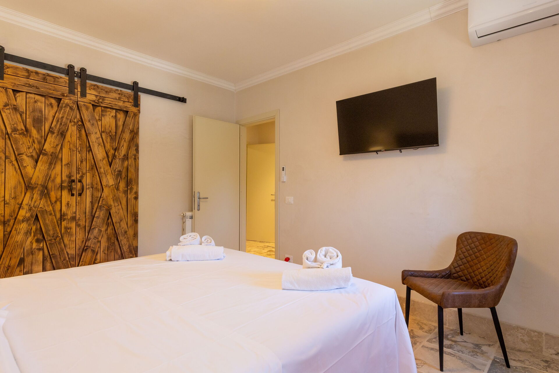 Rez-de-chaussée surélevé: salon (smart TV, air conditionné) avec canapé-lit double, coin repas et kitchenette (lave-vaisselle, four, réfrigérateur, machine à café expresso, grille-pain), chambre double (air conditionné), salle de bain avec douche.