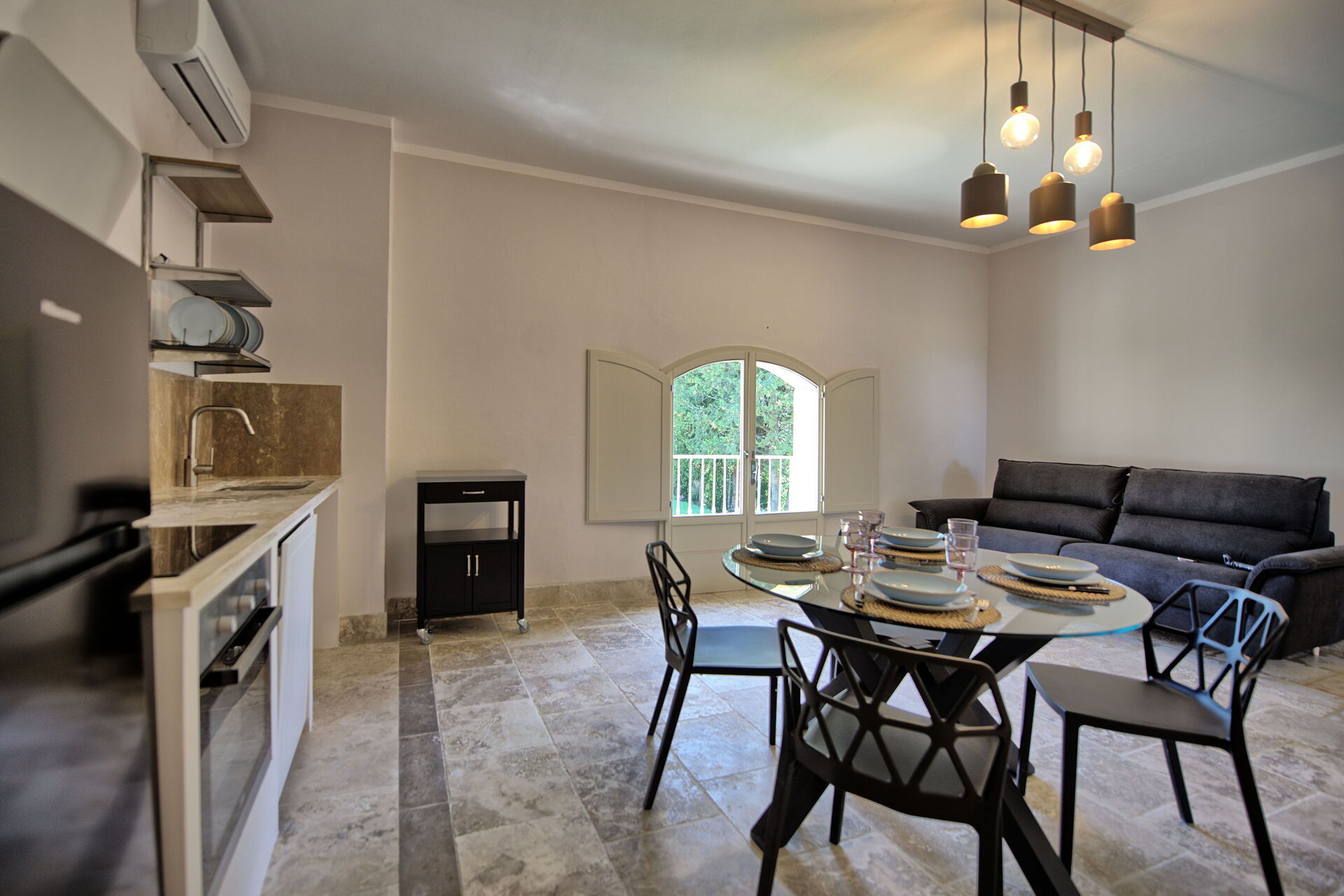 Premier étage: salon (smart TV, air conditionné) avec canapé-lit double, coin repas et kitchenette (lave-vaisselle, four, réfrigérateur, machine à café expresso, grille-pain), chambre double (air conditionné), salle de bain avec douche.